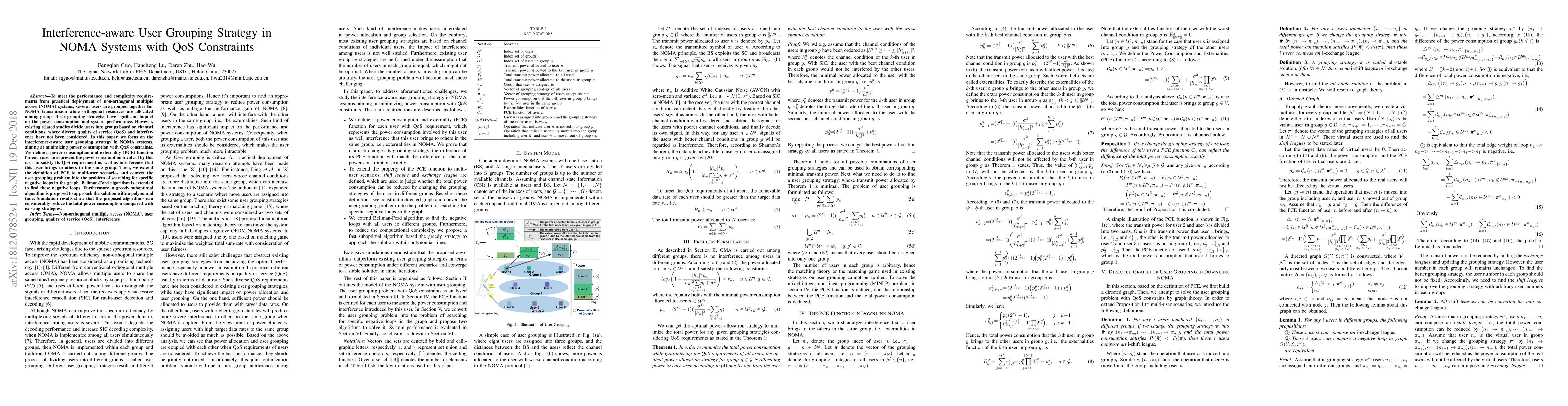 This paper proposes an interference-aware user grouping strategy for non-orthogonal multiple access (NOMA) systems to minimize power consumption under QoS constraints. The authors define a power consumption and externality (PCE) function and extend it to multi-user scenarios, converting the problem into finding specific negative loops in a graph, solved using a modified Bellman-Ford algorithm and a greedy suboptimal approach.