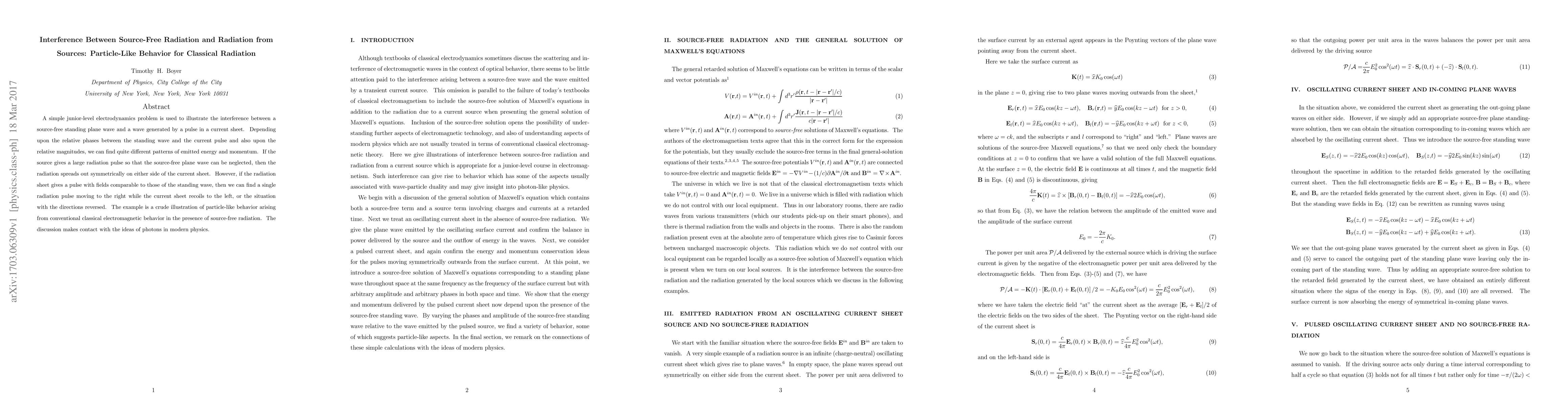 A simple junior-level electrodynamics problem is used to illustrate the interference between a source-free standing plane wave and a wave generated by a pulse in a current sheet. Depending upon the relative phases between the standing wave and the current pulse and also upon the relative magnitudes, we can find quite different patterns of emitted energy and momentum. If the source gives a large radiation pulse so that the source-free plane wave can be neglected, then the radiation spreads out symmetrically on either side of the current sheet. However, if the radiation sheet gives a pulse with fields comparable to those of the standing wave, then we can find a single radiation pulse moving to the right while the current sheet recoils to the left, or the situation with the directions reversed. The example is a crude illustration of particle-like behavior arising from conventional classical electromagnetic behavior in the presence of source-free radiation. The discussion makes contact with the ideas of photons in modern physics.