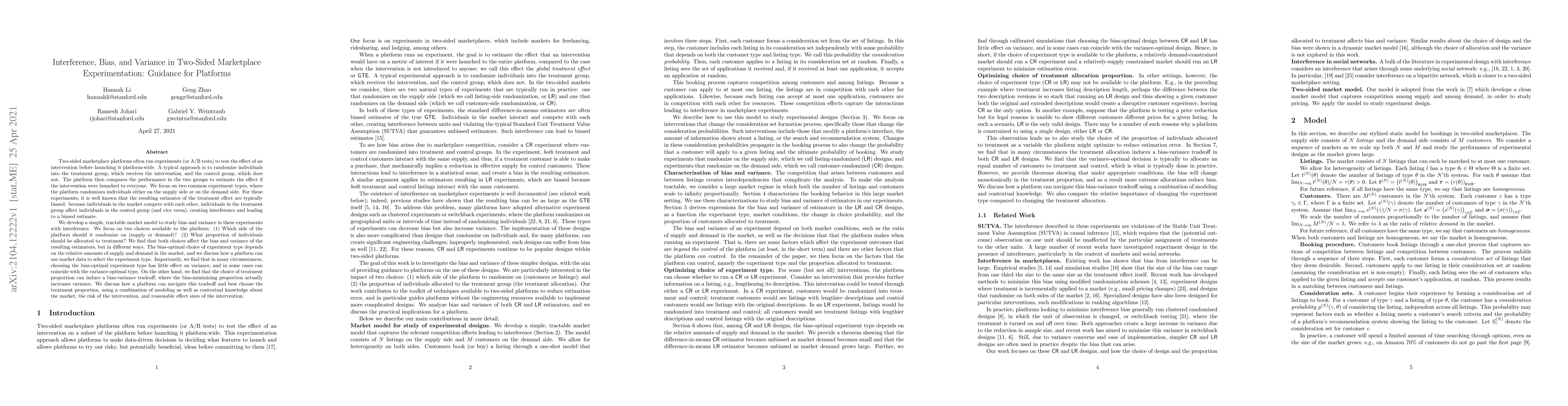 The paper develops a simple tractable market model to study bias and variance in experiments with interference on two-sided marketplace platforms, focusing on supply and demand side randomization choices.