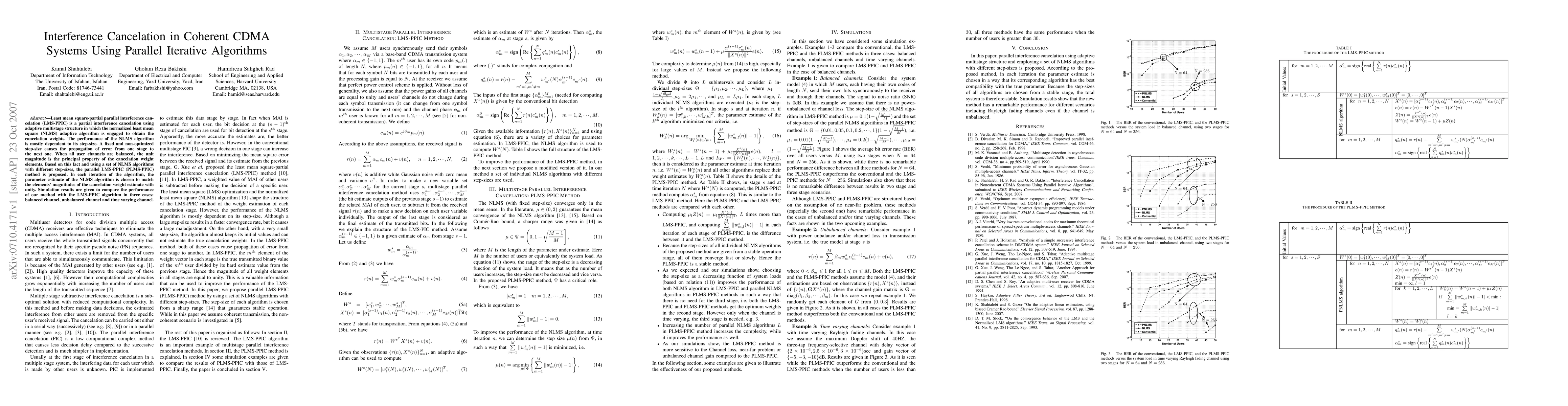 Least mean square-partial parallel interference cancelation (LMS-PPIC) is a partial interference cancelation using adaptive multistage structure in which the normalized least mean square (NLMS) adaptive algorithm is engaged to obtain the cancelation weights. The performance of the NLMS algorithm is mostly dependent to its step-size. A fixed and non-optimized step-size causes the propagation of error from one stage to the next one. When all user channels are balanced, the unit magnitude is the principal property of the cancelation weight elements. Based on this fact and using a set of NLMS algorithms with different step-sizes, the parallel LMS-PPIC (PLMS-PPIC) method is proposed. In each iteration of the algorithm, the parameter estimate of the NLMS algorithm is chosen to match the elements' magnitudes of the cancelation weight estimate with unity. Simulation results are given to compare the performance of our method with the LMS-PPIC algorithm in three cases: balanced channel, unbalanced channel and time varying channel.