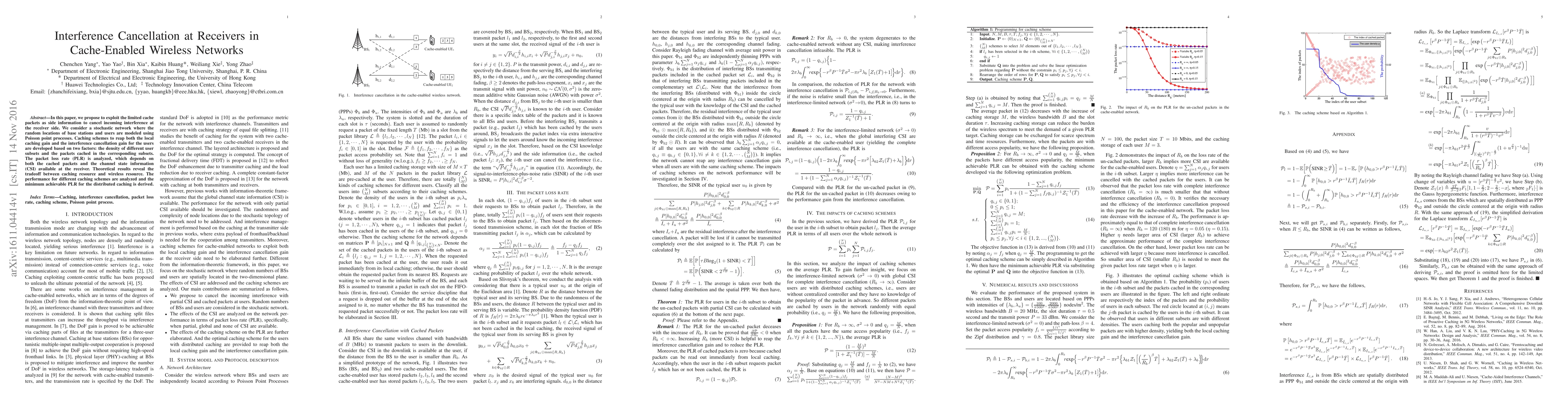 In this paper, we propose to exploit the limited cache packets as side information to cancel incoming interference at the receiver side. We consider a stochastic network where the random locations of base stations and users are modeled using Poisson point processes. Caching schemes to reap both the local caching gain and the interference cancellation gain for the users are developed based on two factors: the density of different user subsets and the packets cached in the corresponding subsets. The packet loss rate (PLR) is analyzed, which depends on both the cached packets and the channel state information (CSI) available at the receiver. Theoretical results reveal the tradeoff between caching resource and wireless resource. The performance for different caching schemes are analyzed and the minimum achievable PLR for the distributed caching is derived.