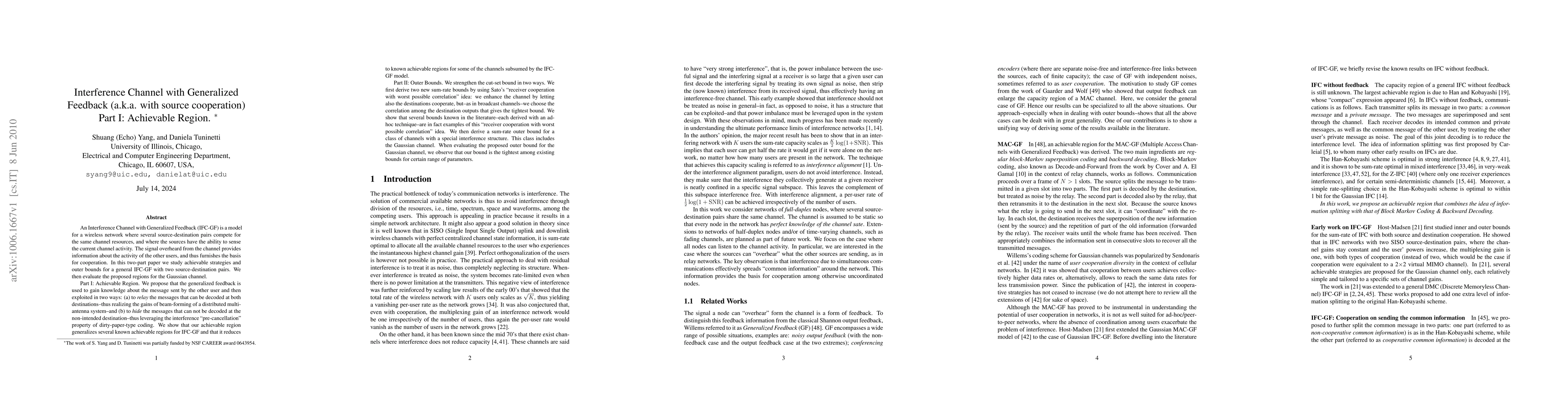 An Interference Channel with Generalized Feedback (IFC-GF) is a model for a wireless network where several source-destination pairs compete for the same channel resources, and where the sources have the ability to sense the current channel activity. The signal overheard from the channel provides information about the activity of the other users, and thus furnishes the basis for cooperation. In this two-part paper we study achievable strategies and outer bounds for a general IFC-GF with two source-destination pairs. We then evaluate the proposed regions for the Gaussian channel. Part I: achievable region. We propose that the generalized feedback is used to gain knowledge about the message sent by other user and then exploited in two ways: (a) to {\em relay} the messages that can be decoded at both destinations--thus realizing the gains of beam-forming of a distributed multi-antenna system--and (b) to {\em hide} the messages that can not be decoded at the non-intended destination--thus leveraging the interference "pre-cancellation" property of dirty-paper-type coding. We show that our achievable region generalizes several known achievable regions for IFC-GF and that it reduces to known achievable regions for some of the channels subsumed by the IFC-GF model.