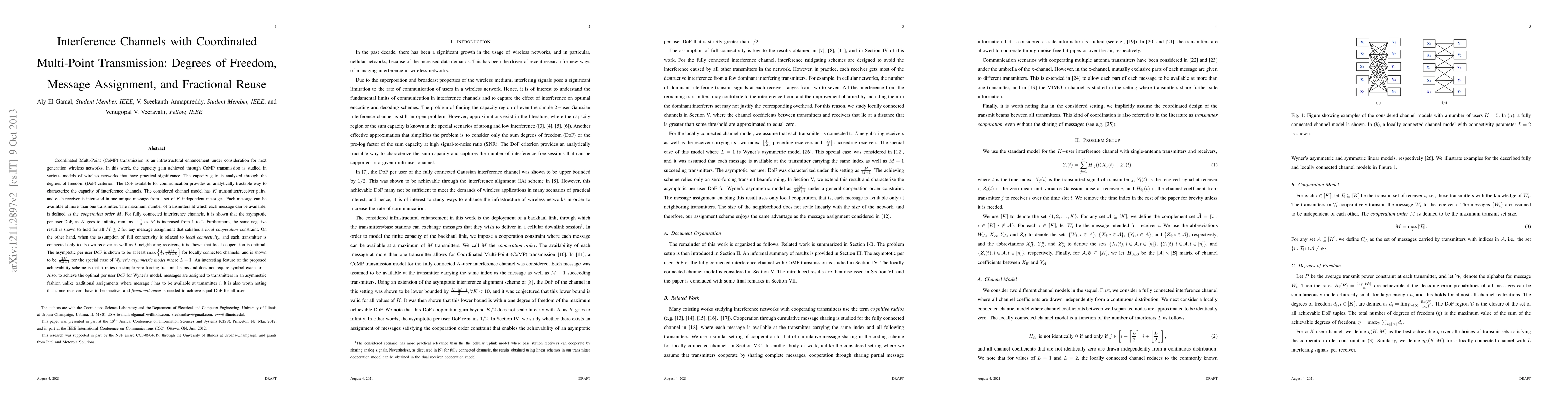 This research explores Coordinated Multi-Point (CoMP) transmission's capacity gains in wireless networks, analyzing it via degrees of freedom (DoF). For fully connected channels, DoF per user remains 1/2 as cooperation order M increases from 1 to 2, and this holds for M > 1 under local cooperation constraints. Local connectivity relaxes full connectivity, enabling higher DoF; it's at least max {1/2, 2M/(2M+L)} for any L, and 2M/(2M+1) for Wyner's asymmetric model (L=1). The proposed scheme uses simple zero-forcing beams without symbol extensions and asymmetric message assignment.