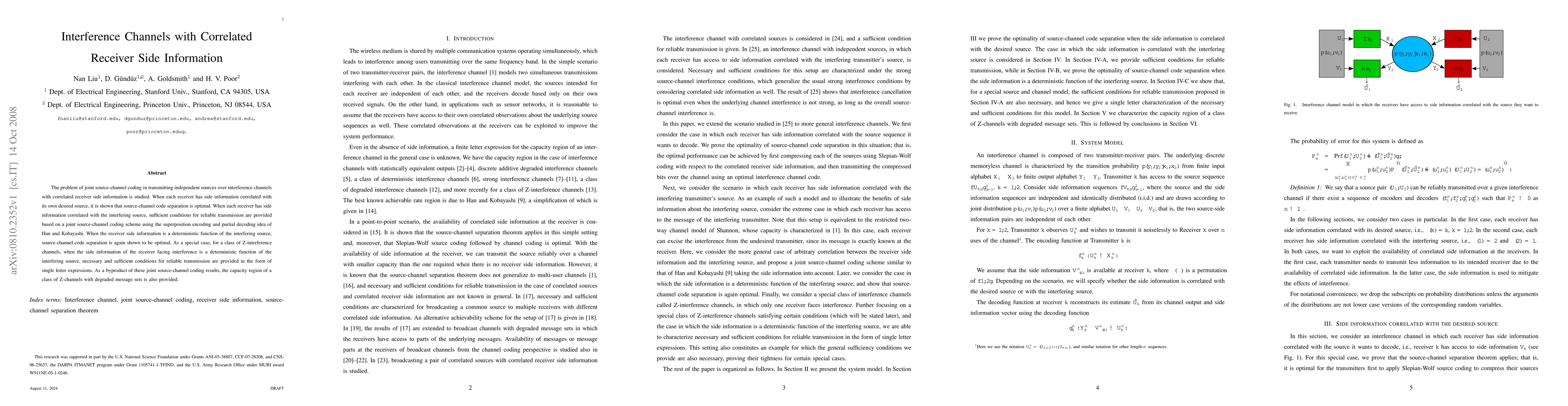 This paper investigates joint source-channel coding for independent sources over interference channels with correlated receiver side information, demonstrating optimal source-channel code separation under various conditions. It provides sufficient conditions for reliable transmission using superposition encoding and partial decoding, and derives necessary and sufficient conditions for Z-interference channels.