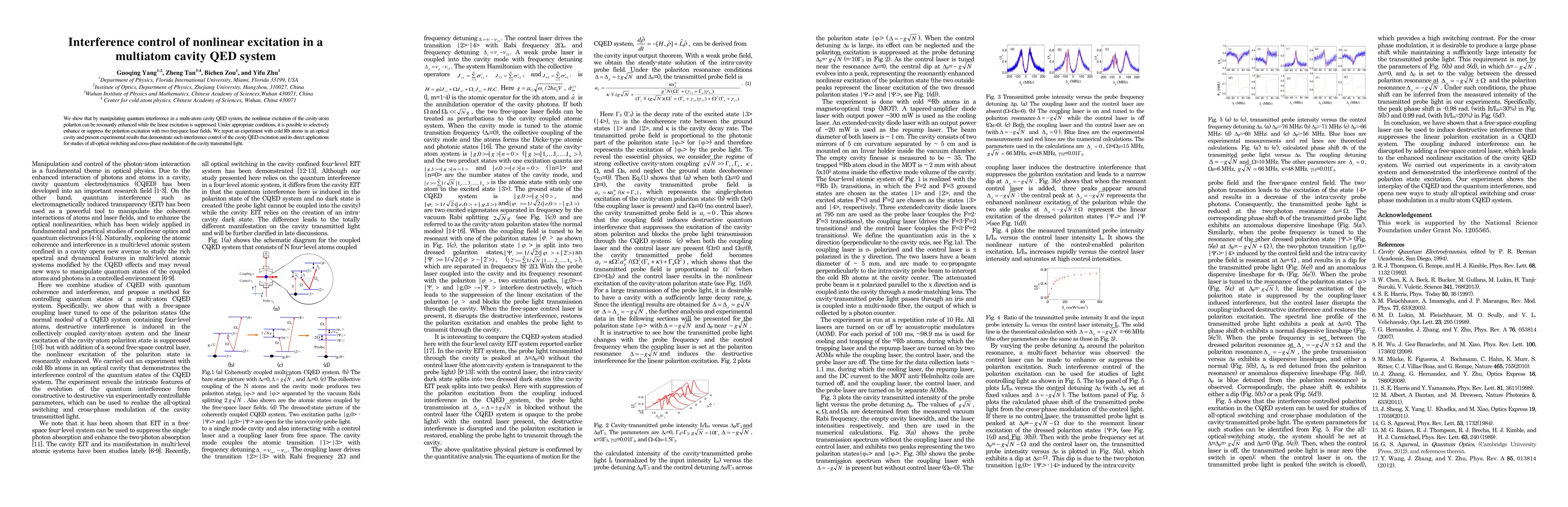 This research demonstrates how quantum interference in a multi-atom cavity QED system can be manipulated to selectively enhance or suppress nonlinear excitation of cavity-atom polaritons using two free-space laser fields. Experimental results with cold Rb atoms show successful interference control, with potential applications in all-optical switching and cross-phase modulation.