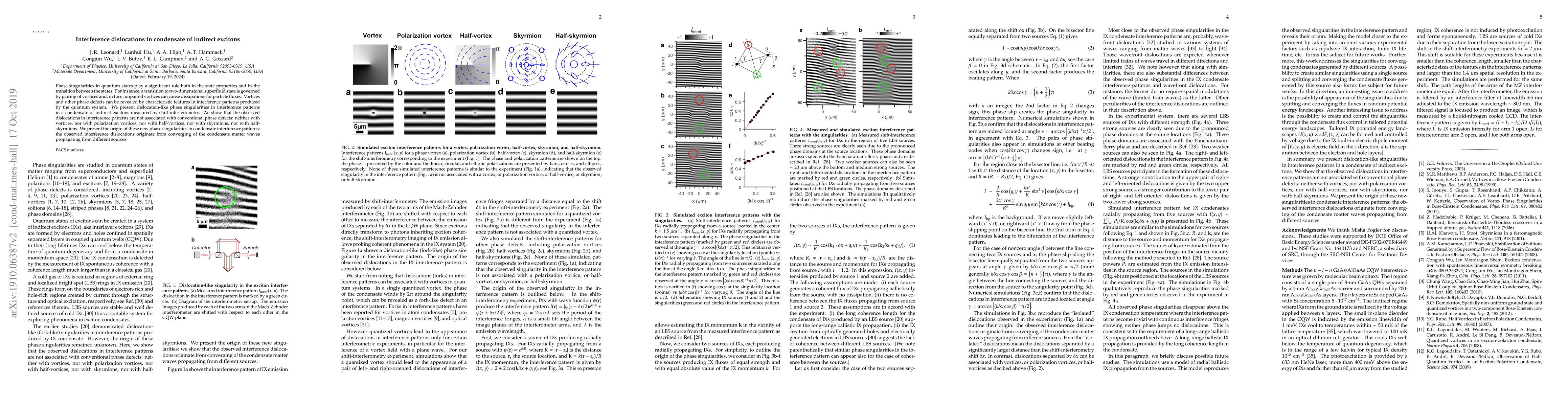 This paper investigates unique dislocation-like phase singularities in interference patterns of indirect exciton condensates, revealing they arise from converging matter waves from different sources rather than conventional phase defects like vortices or skyrmions. These findings provide new insights into the behavior of quantum states and their transitions.