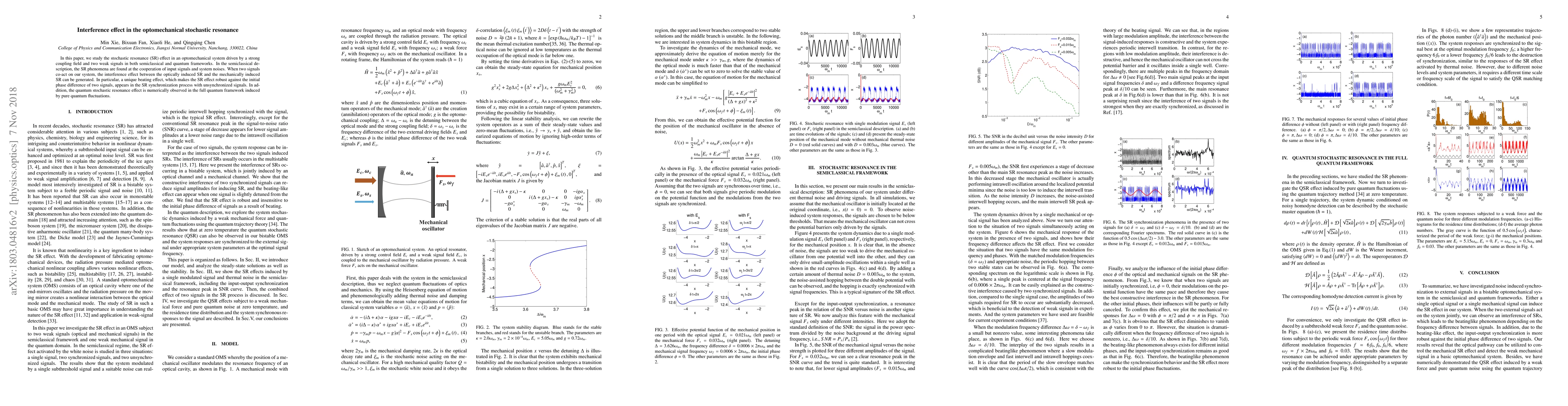This paper investigates stochastic resonance in an optomechanical system driven by a strong coupling field and two weak signals, revealing interference effects between optically and mechanically induced SR. A unique beating effect enhances SR robustness against signal phase differences, and quantum stochastic resonance is observed in the quantum framework.