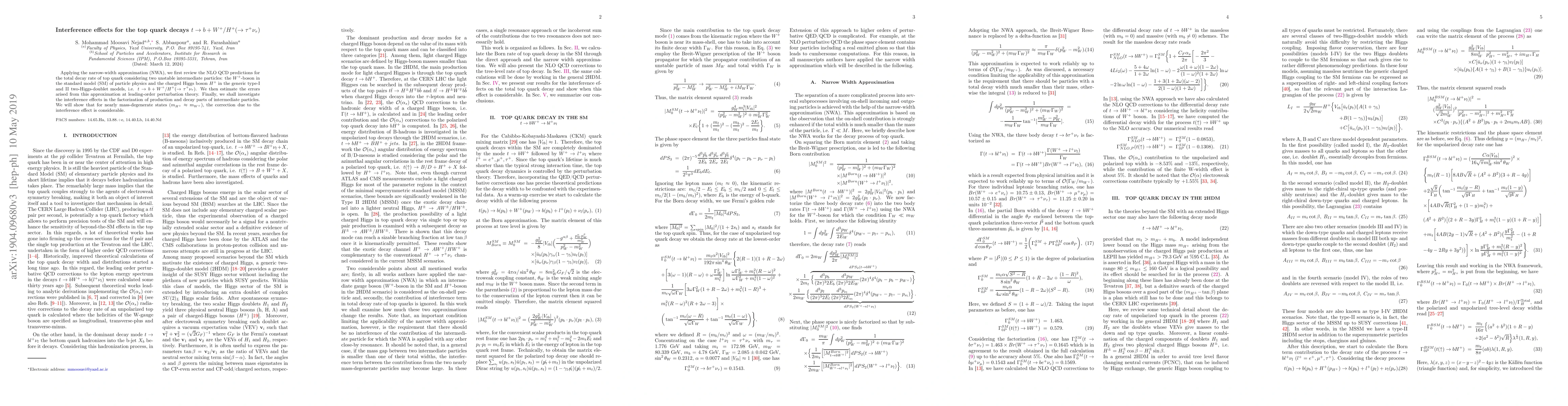 Applying the narrow-width approximation (NWA), we first review the NLO QCD predictions for the total decay rate of top quark considering two unstable intermediate particles: the $W^+$-boson in the standard model (SM) of particle physics and the charged Higgs boson $H^+$ in the generic type-I and II two-Higgs-doublet models, i.e. $t\to b+W^+/H^+(\to \tau^+\nu_\tau)$. We then estimate the errors arised from this approximation at leading-order perturbation theory. Finally, we shall investigate the interference effects in the factorization of production and decay parts of intermediate particles. We will show that for nearly mass-degenerate states ($m_{H^+}\approx m_{W^+}$), the correction due to the interference effect is considerable.