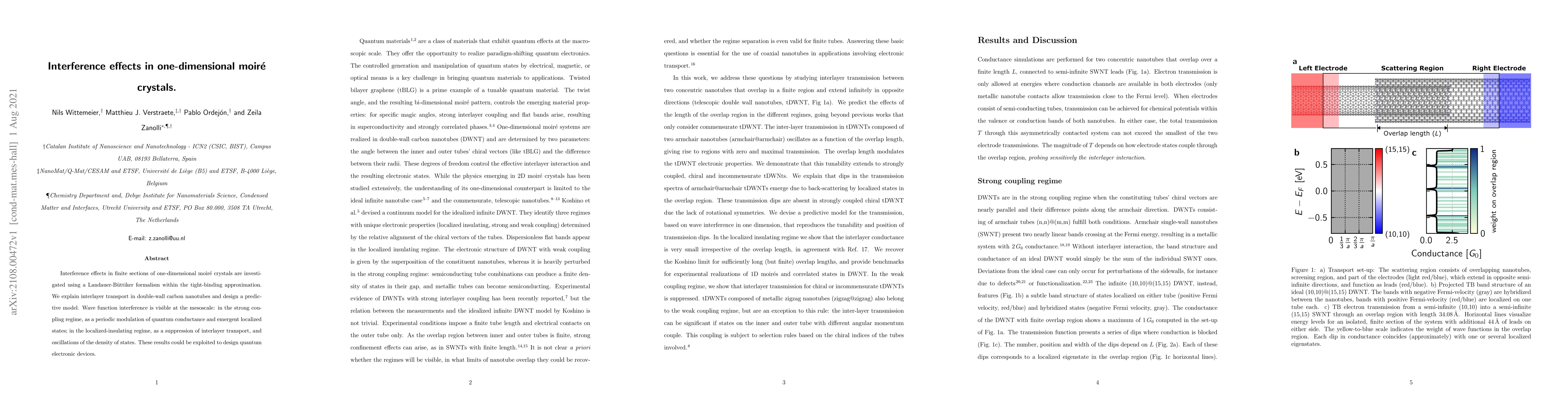 Interference effects in finite sections of one-dimensional moir\'e crystals are investigated using a Landauer-B\"uttiker formalism within the tight-binding approximation. We explain interlayer transport in double-wall carbon nanotubes and design a predictive model. Wave function interference is visible at the mesoscale: in the strong coupling regime, as a periodic modulation of quantum conductance and emergent localized states; in the localized-insulating regime, as a suppression of interlayer transport, and oscillations of the density of states. These results could be exploited to design quantum electronic devices.