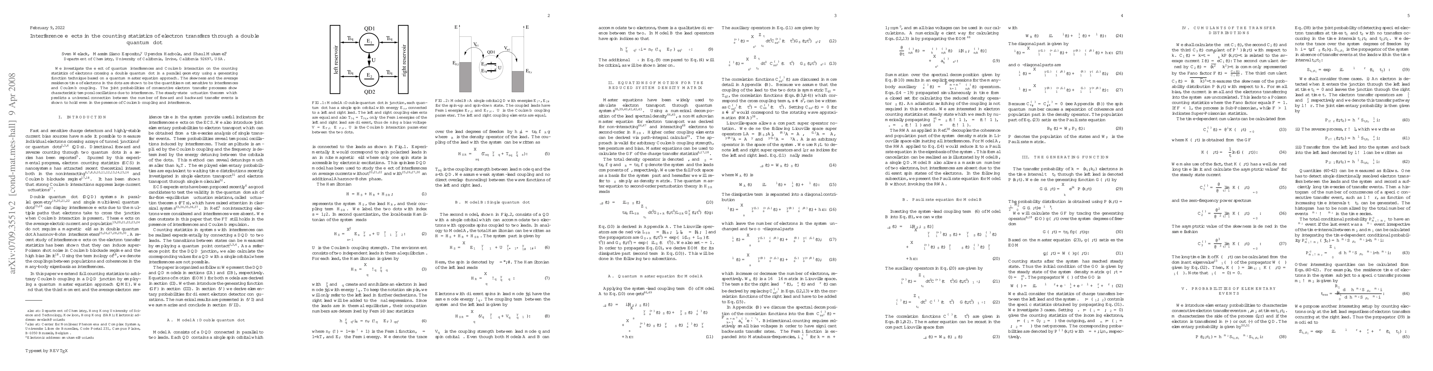 This research uses a quantum master equation approach to study how quantum interferences and Coulomb interactions affect electron movements through a double quantum dot. It finds that electron residence time and skewness are most impacted, with interference causing temporal oscillations in consecutive transfer probabilities. Despite Coulomb coupling and interference, the steady-state fluctuation theorem linking forward and backward transfer events still applies.
