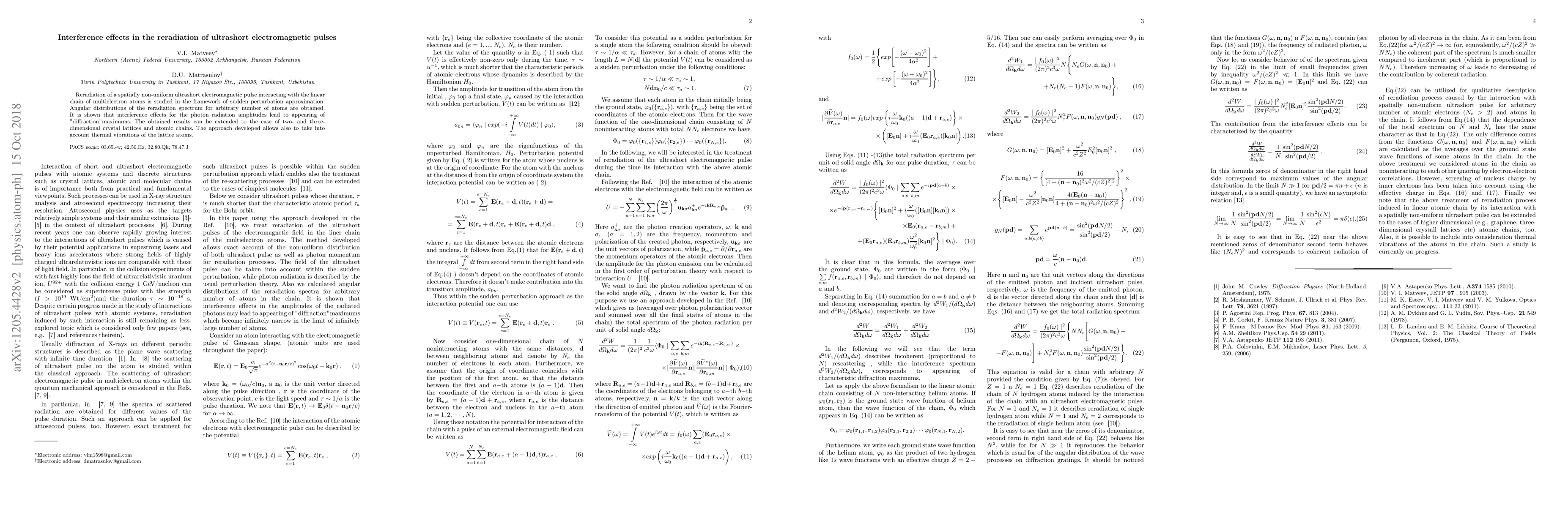 This paper investigates the reradiation of ultrashort electromagnetic pulses by a linear chain of multielectron atoms, revealing interference effects that produce "diffraction" maximums in the angular distribution of the reradiated spectrum. The developed approach can be extended to more complex crystal lattices and accounts for thermal vibrations of lattice atoms.