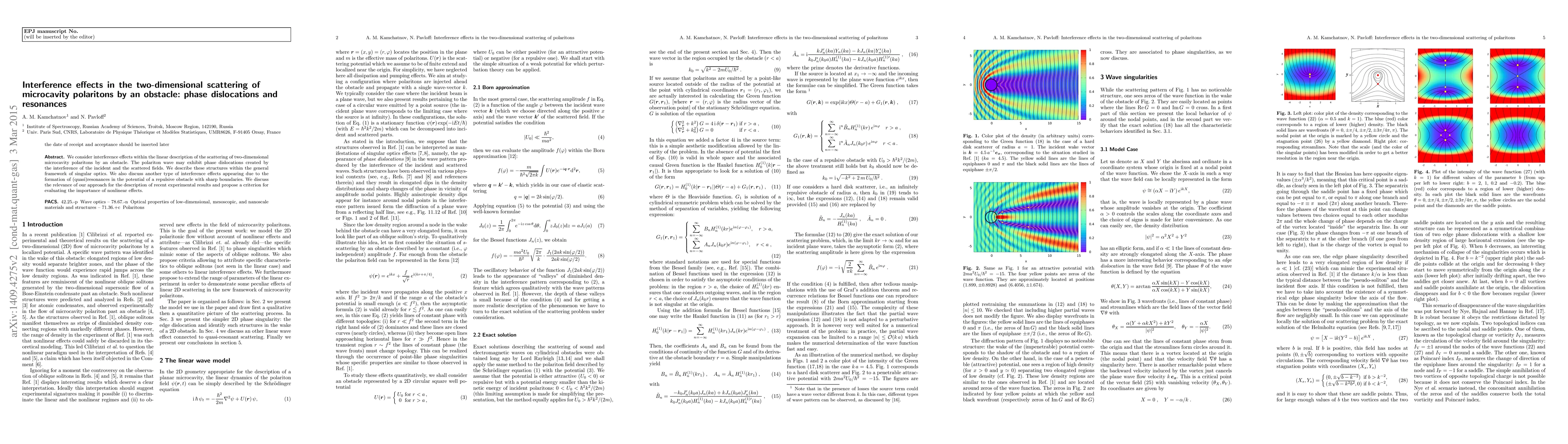 This paper investigates interference effects in the scattering of two-dimensional microcavity polaritons by an obstacle, focusing on phase dislocations and resonances. It employs singular optics to describe polariton wave interference and discusses the implications for recent experimental observations.
