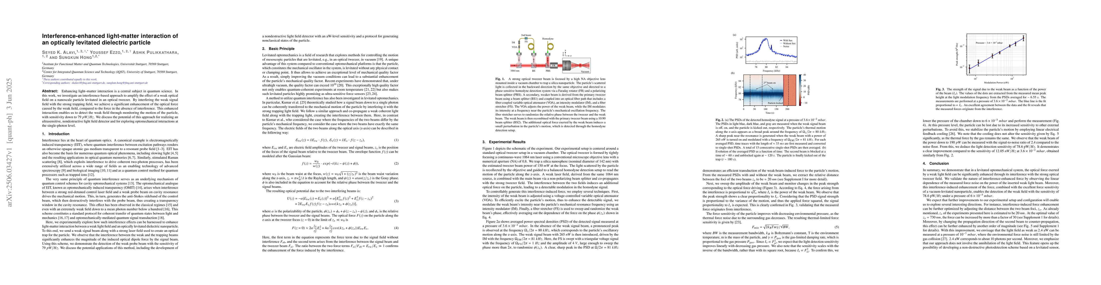 This research presents a novel approach to amplifying weak optical field effects on levitated particles through field interference, surpassing existing detection sensitivities.