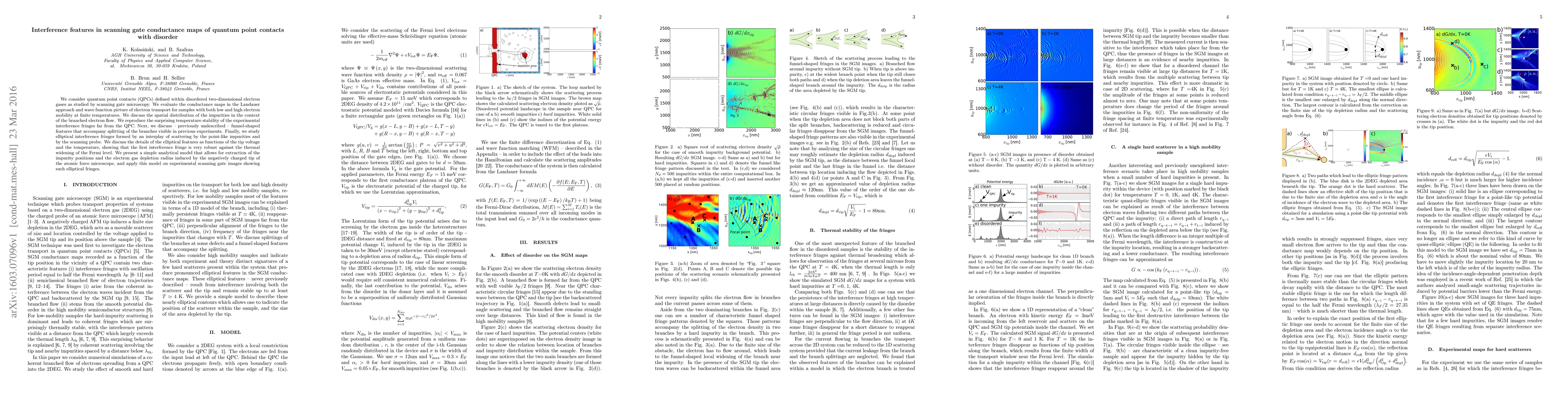 We consider quantum point contacts (QPCs) defined within disordered two-dimensional electron gases as studied by scanning gate microscopy. We evaluate the conductance maps in the Landauer approach and wave function picture of electron transport for samples with both low and high electron mobility at finite temperatures. We discuss the spatial distribution of the impurities in the context of the branched electron flow. We reproduce the surprising temperature stability of the experimental interference fringes far from the QPC. Next, we discuss -- previously undescribed -- funnel-shaped features that accompany splitting of the branches visible in previous experiments. Finally, we study elliptical interference fringes formed by an interplay of scattering by the point-like impurities and by the scanning probe. We discuss the details of the elliptical features as functions of the tip voltage and the temperature, showing that the first interference fringe is very robust against the thermal widening of the Fermi level. We present a simple analytical model that allows for extraction of the impurity positions and the electron gas depletion radius induced by the negatively charged tip of the atomic force microscope, and apply this model on experimental scanning gate images showing such elliptical fringes.