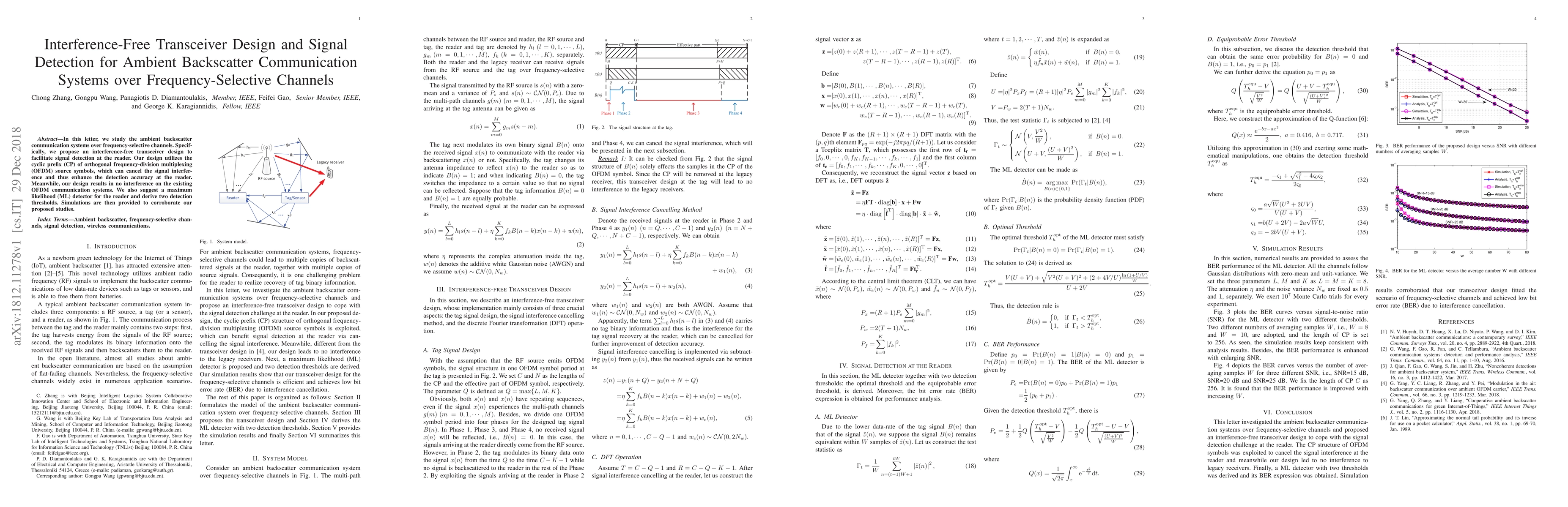 This paper proposes an interference-free transceiver design for ambient backscatter communication systems over frequency-selective channels, utilizing cyclic prefix OFDM to cancel signal interference and enhance detection accuracy. The design does not interfere with existing OFDM systems, and a maximum likelihood detector with two detection thresholds is suggested.
