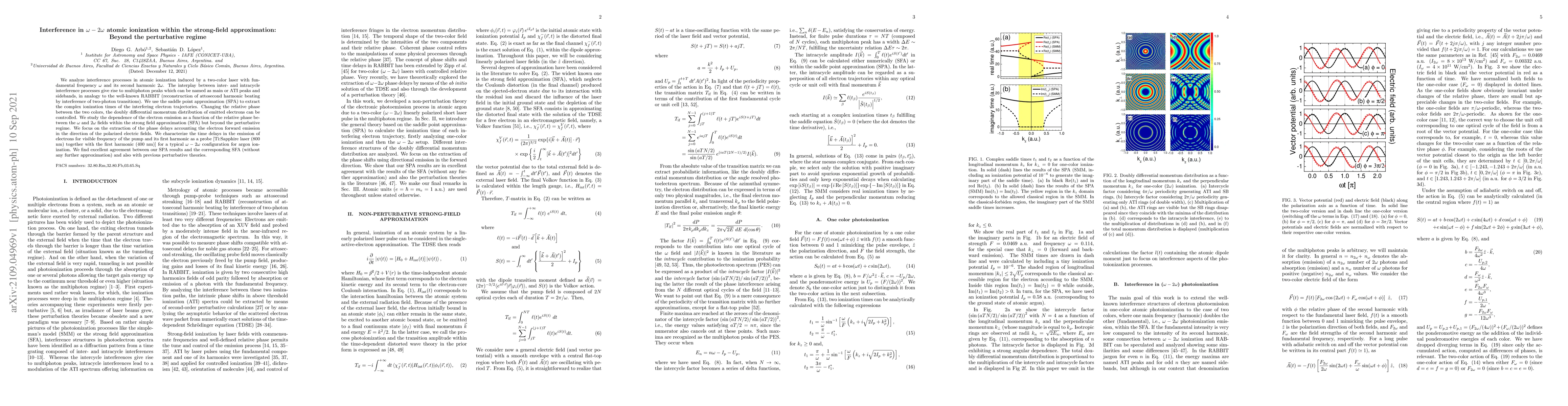 We analyze interference processes in atomic ionization induced by a two-color laser with fundamental frequency $\omega $ and its second harmonic $2\omega $. The interplay between inter- and intracycle interference processes give rise to multiphoton peaks which can be named as main or ATI peaks and sidebands, in analogy to the well-known RABBIT (reconstruction of attosecond harmonic beating by interference of two-photon transitions). We use the saddle point approximation (SPA) to extract the complex ionization times of the interfering electron trajectories. Changing the relative phase between the two colors, the doubly differential momentum distribution of emitted electrons can be controlled. We study the dependence of the electron emission as a function of the relative phase between the $\omega $ and $% 2\omega $ fields within the strong field approximation (SFA) but beyond the perturbative regime. We focus on the extraction of the phase delays accounting the electron forward emission in the direction of the polarized electric fields. We characterize the time delays in the emission of electrons for visible frequency of the pump and its first harmonic as a probe [Ti:Sapphire laser ($800$ nm) together with the first harmonic ($400$ nm)] for a typical $\omega -2\omega $ configuration for argon ionization. We find excellent agreement between our SPA results and the corresponding SFA (without any further approximation) and also with previous perturbative theories.
