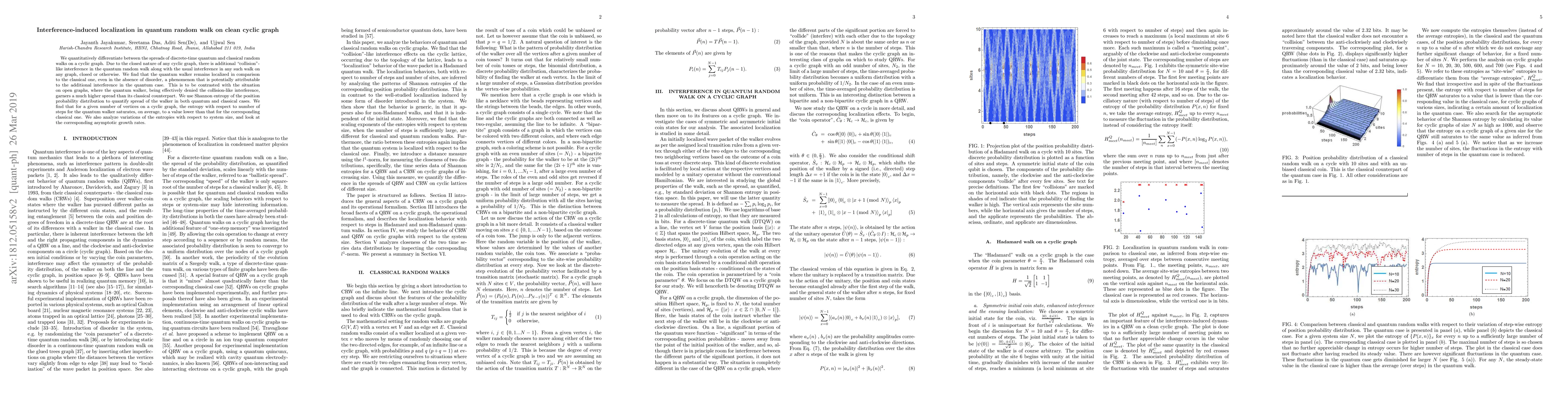 We quantitatively differentiate between the spreads of discrete-time quantum and classical random walks on a cyclic graph. Due to the closed nature of any cyclic graph, there is additional "collision"- like interference in the quantum random walk along with the usual interference in any such walk on any graph, closed or otherwise. We find that the quantum walker remains localized in comparison to the classical one, even in the absence of disorder, a phenomenon that is potentially attributable to the additional interference in the quantum case. This is to be contrasted with the situation on open graphs, where the quantum walker, being effectively denied the collision-like interference, garners a much higher spread than its classical counterpart. We use Shannon entropy of the position probability distribution to quantify spread of the walker in both quantum and classical cases. We find that for a given number of vertices on a cyclic graph, the entropy with respect to number of steps for the quantum walker saturates, on average, to a value lower than that for the corresponding classical one. We also analyze variations of the entropies with respect to system size, and look at the corresponding asymptotic growth rates.
