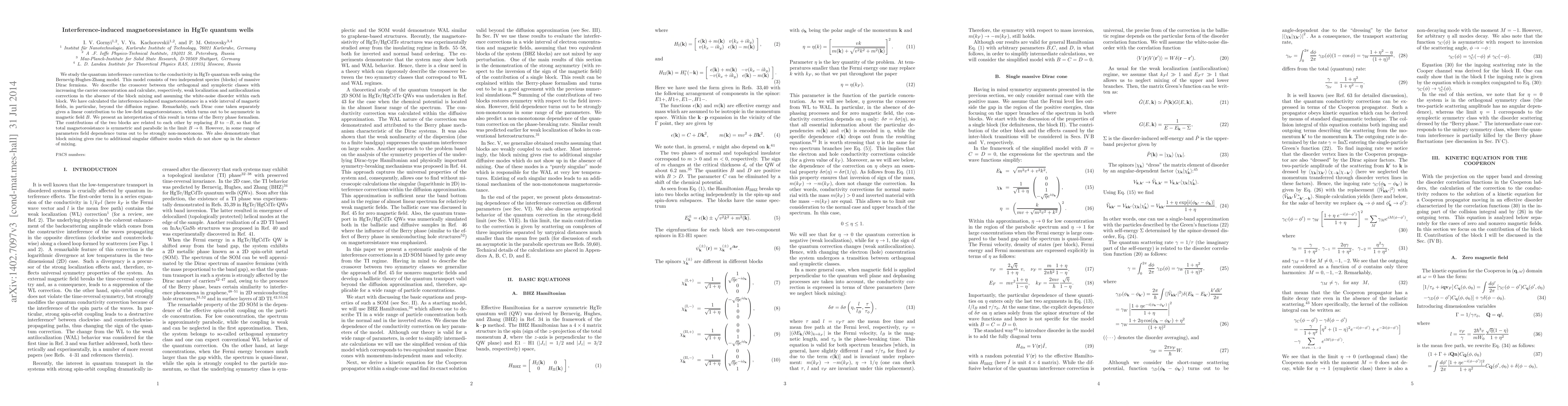We study the quantum interference correction to the conductivity in HgTe quantum wells using the Bernevig-Hughes-Zhang model. This model consists of two independent species (blocks) of massive Dirac fermions. We describe the crossover between the orthogonal and symplectic classes with the increasing the carrier concentration and calculate, respectively, weak localization and antilocalization corrections in the absence of the block mixing and assuming the white-noise disorder within each block. We have calculated the interference-induced magnetoresistance in a wide interval of magnetic fields, in particular, beyond the diffusion regime. Remarkably, each Dirac cone taken separately gives a linear contribution to the low-field magnetoresistance, which turns out to be asymmetric in magnetic field $B$. We present an interpretation of this result in terms of the Berry phase formalism. The contributions of the two blocks are related to each other by replacing $B$ to $-B$, so that the total magnetoresistance is symmetric and parabolic in the limit $B\to 0$. However, in some range of parameters field dependence turns out to be strongly non-monotonous. We also demonstrate that block mixing gives rise to additional singular diffusive modes which do not show up in the absence of mixing.