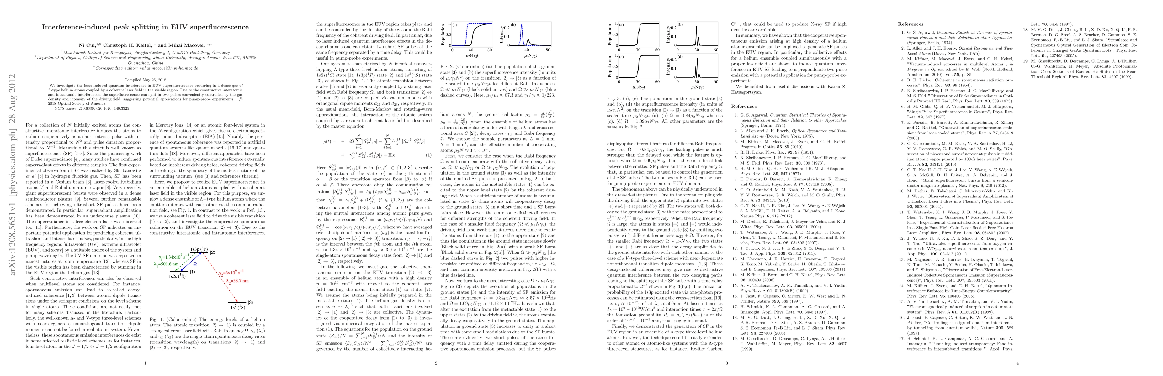 We investigate the laser-induced quantum interference in EUV superfluorescence occurring in a dense gas of $\Lambda$-type helium atoms coupled by a coherent laser field in the visible region. Due to the constructive interatomic and intraatomic interferences, the superfluorescence can split in two pulses conveniently controlled by the gas density and intensity of the driving field, suggesting potential applications for pump-probe experiments.
