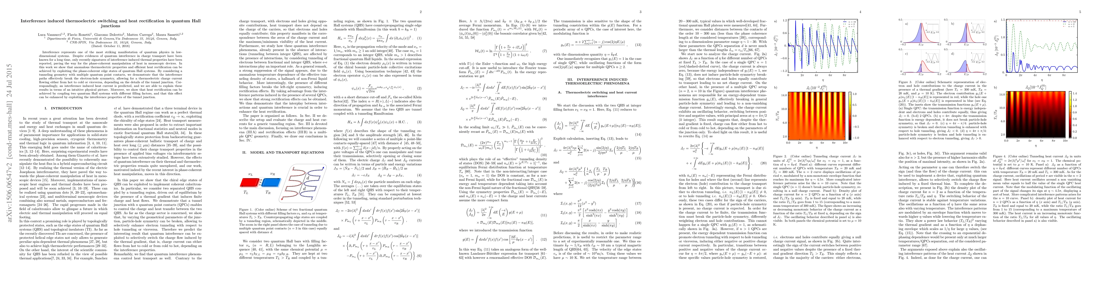 This paper demonstrates that quantum interference in quantum Hall junctions can induce thermoelectric switching and heat rectification, breaking electron-hole symmetry through phase-coherent edge states. It shows how heat rectification can be achieved by coupling quantum Hall systems with different filling factors, enhanced by interference properties.