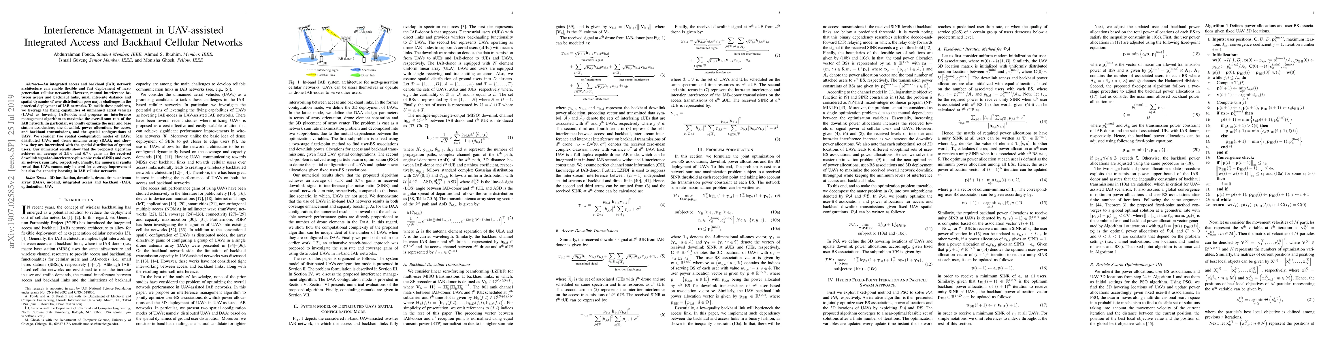 This paper proposes an interference management algorithm for UAV-assisted integrated access and backhaul cellular networks, optimizing user and base station associations, power allocations, and UAV configurations to enhance network sum rate. The study demonstrates significant improvements in signal quality and network capacity using UAVs in both distributed and drone antenna array configurations.
