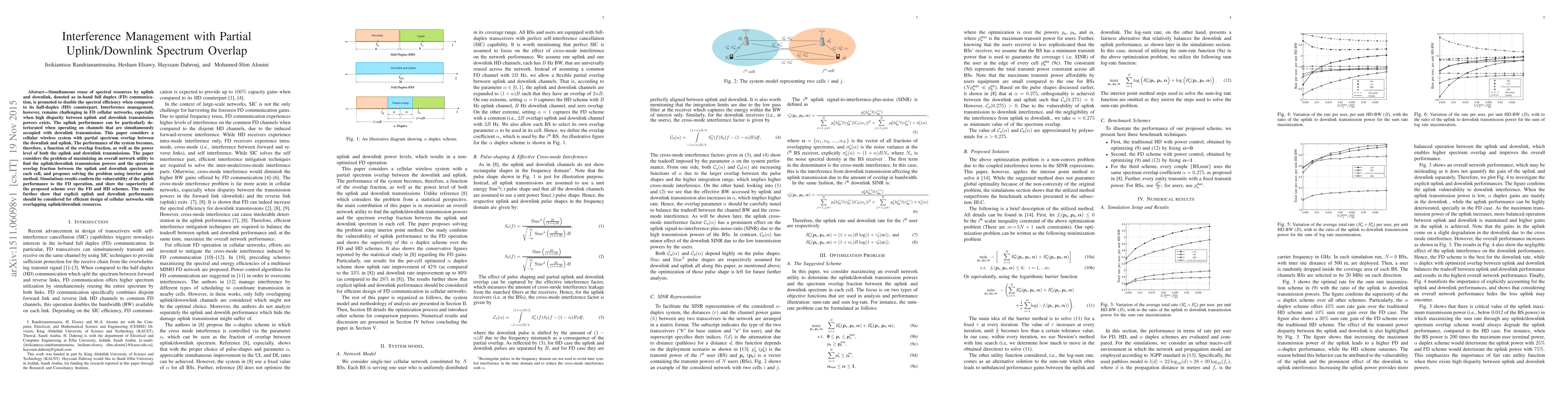 This paper explores interference management in in-band full duplex cellular networks with partial spectrum overlap between uplink and downlink. It proposes an optimization scheme to maximize network utility by determining optimal transmission powers and overlap fraction, using the interior point method, and demonstrates its performance benefits over full duplex and half-duplex schemes.