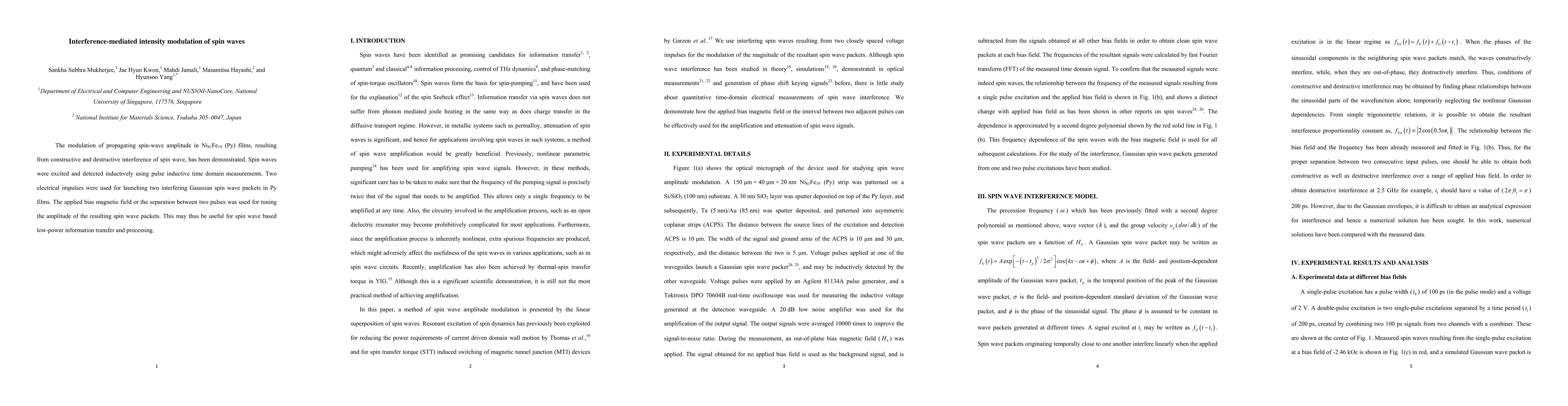 This study demonstrates the modulation of spin wave amplitude in Py films through constructive and destructive interference, potentially enabling low-power information transfer and processing. Spin waves were excited and detected using pulse inductive time domain measurements, with amplitude tuning achieved via magnetic field or pulse separation.