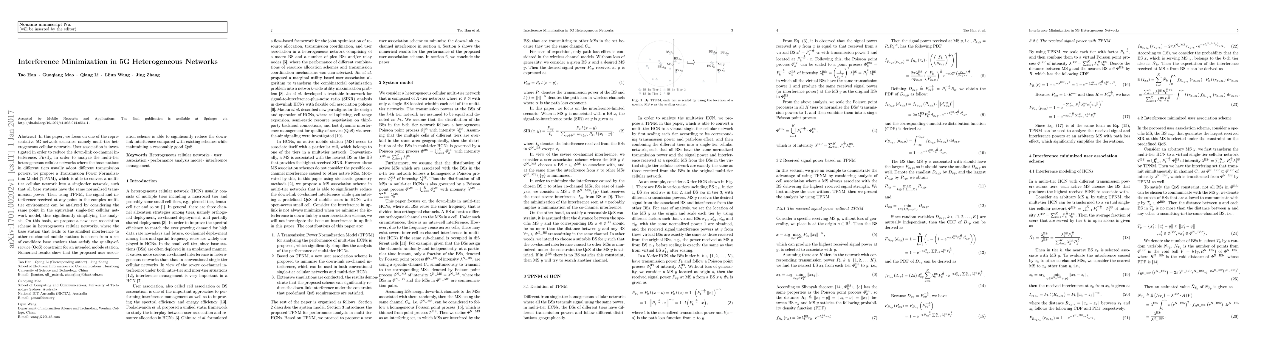 This paper proposes a Transmission Power Normalization Model (TPNM) to simplify interference analysis in multi-tier heterogeneous 5G networks by converting them into equivalent single-tier networks. It introduces a user association scheme that selects base stations minimizing co-channel interference while maintaining quality-of-service, showing significant reduction in down-link interference compared to existing methods.