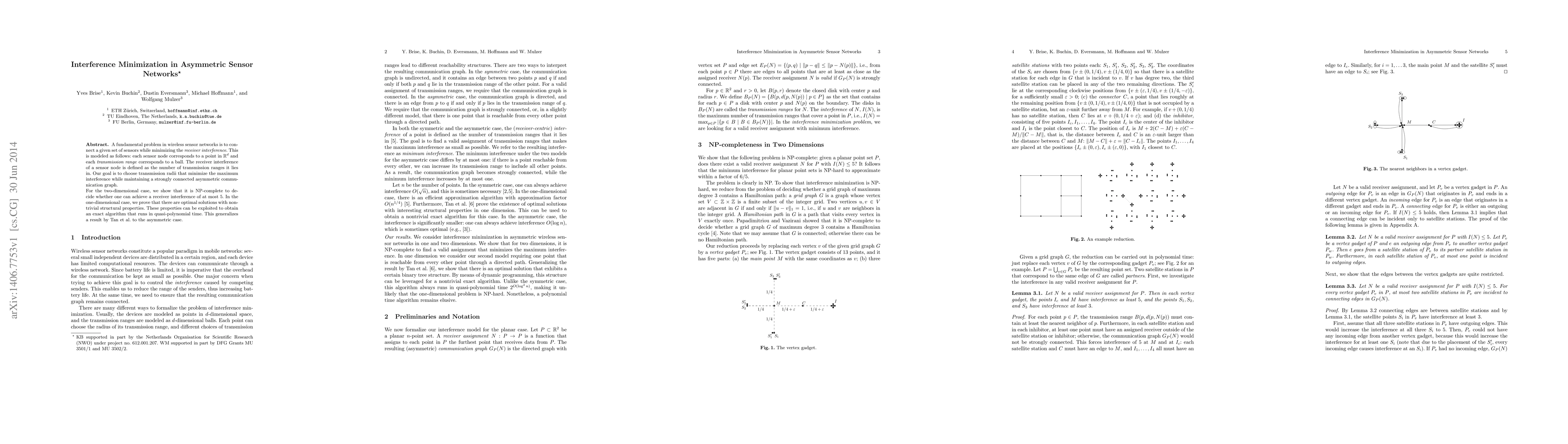 Researchers investigate minimizing receiver interference in asymmetric sensor networks, finding that achieving a receiver interference of at most 5 is NP-complete in 2D cases, but solvable in 1D cases with quasi-polynomial time algorithms.