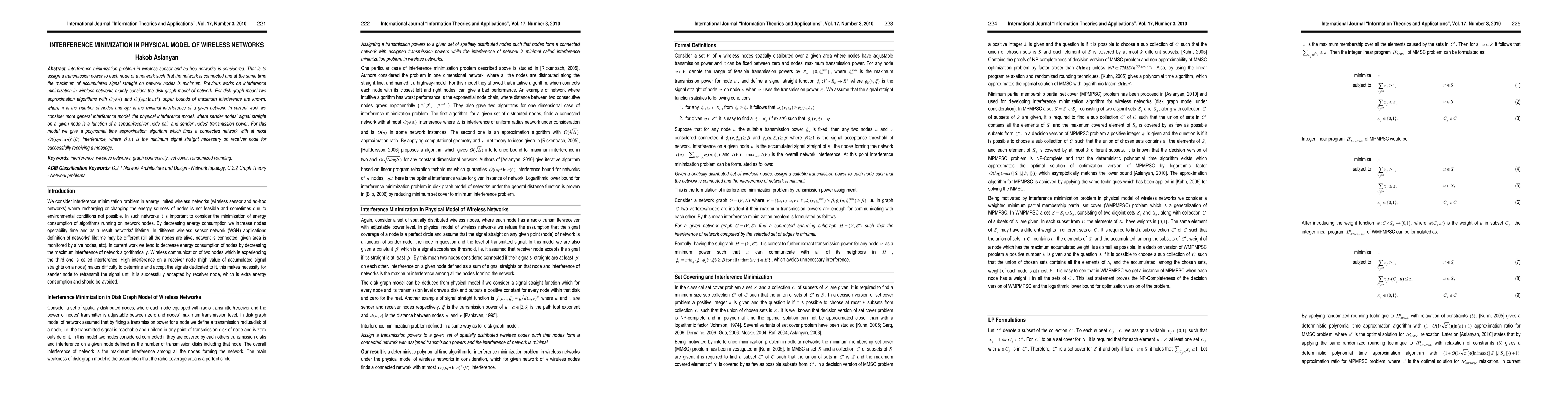 This paper proposes a polynomial time approximation algorithm for minimizing interference in wireless sensor and ad-hoc networks using a physical interference model, achieving interference at most $O((opt\ln{n})^{2}/\beta)$ where $\beta$ is the minimum signal strength required for successful reception. It extends beyond the disk graph model to consider a more general interference model.