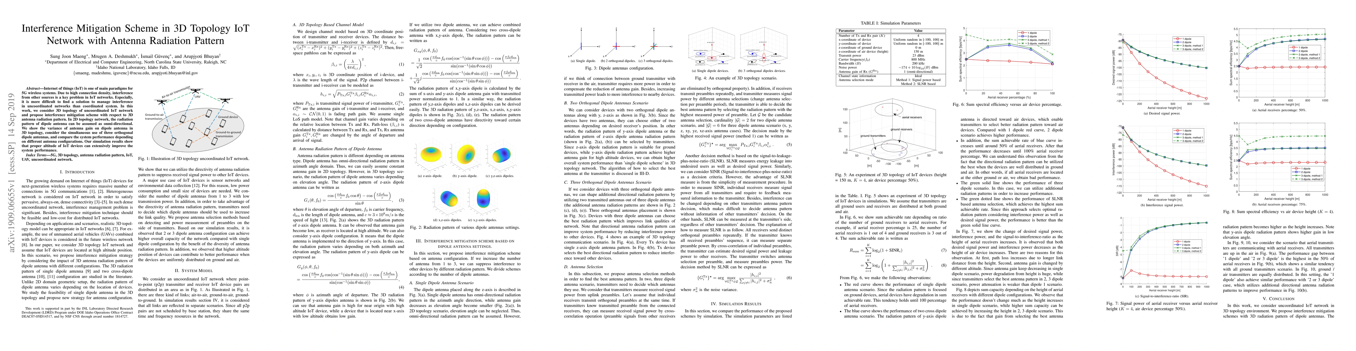 Internet of things (IoT) is one of main paradigms for 5G wireless systems. Due to high connection density, interference from other sources is a key problem in IoT networks. Especially, it is more difficult to find a solution to manage interference in uncoordinated networks than coordinated system. In this work, we consider 3D topology of uncoordinated IoT network and propose interference mitigation scheme with respect to 3D antenna radiation pattern. In 2D topology network, the radiation pattern of dipole antenna can be assumed as onmi-directional. We show the variance of antenna gain on dipole antenna in 3D topology, consider the simultaneous use of three orthogonal dipole antennas, and compare the system performance depending on different antenna configurations. Our simulation results show that proper altitude of IoT devices can extensively improve the system performance.
