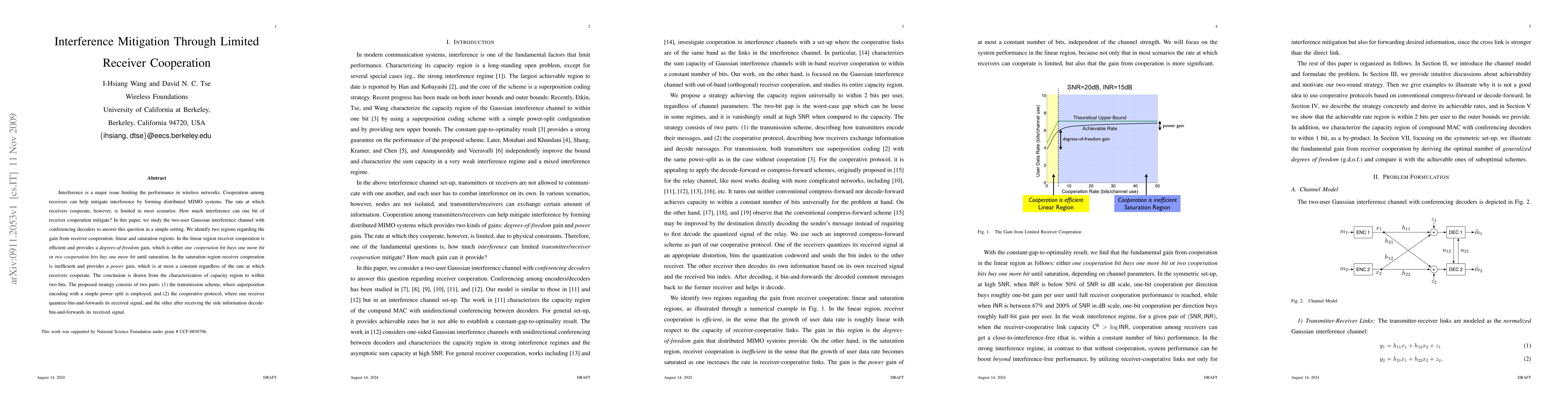 This paper investigates how limited receiver cooperation can mitigate interference in wireless networks, identifying two regions: linear and saturation. In the linear region, cooperation provides a degrees-of-freedom gain, while in the saturation region, it offers a power gain at most. The study employs a two-user Gaussian interference channel with conferencing decoders to characterize capacity regions.