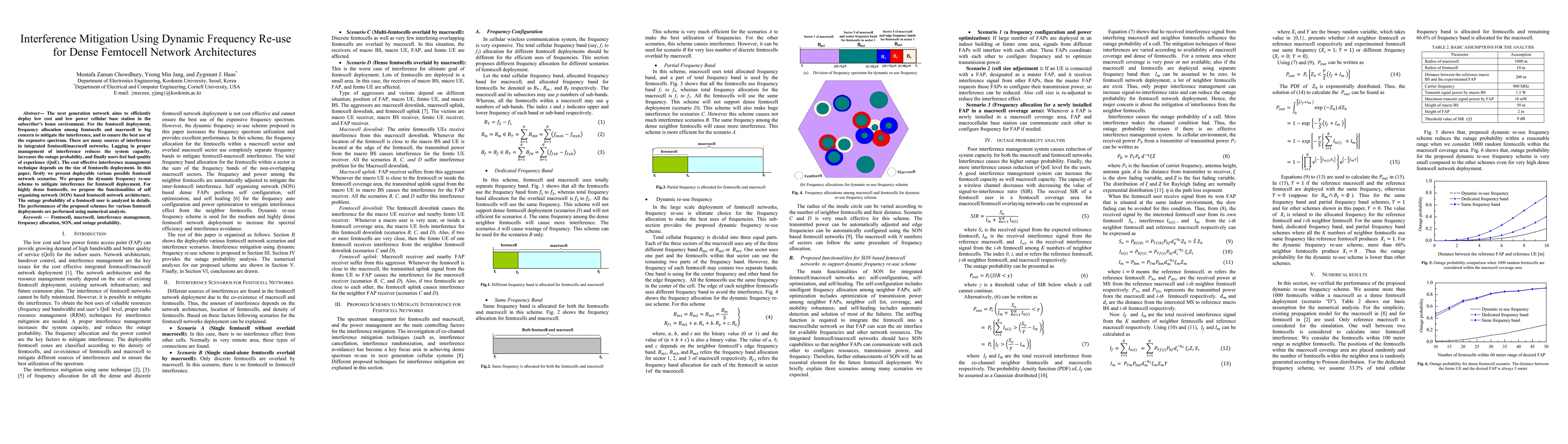 The next generation network aims to efficiently deploy low cost and low power cellular base station in the subscriber's home environment. For the femtocell deployment, frequency allocation among femtocells and macrocell is big concern to mitigate the interference, and to ensure the best use of the expensive spectrum. There are many sources of interference in integrated femtocell/macrocell networks. Lagging in proper management of interference reduces the system capacity, increases the outage probability, and finally users feel bad quality of experience (QoE). The cost effective interference management technique depends on the size of femtocells deployment. In this paper, firstly we present deployable various possible femtocell network scenarios. We propose the dynamic frequency re-use scheme to mitigate interference for femtocell deployment. For highly dense femtocells, we propose the functionalities of self organizing network (SON) based femtocell network architecture. The outage probability of a femtocell user is analyzed in details. The performances of the proposed schemes for various femtocell deployments are performed using numerical analysis.