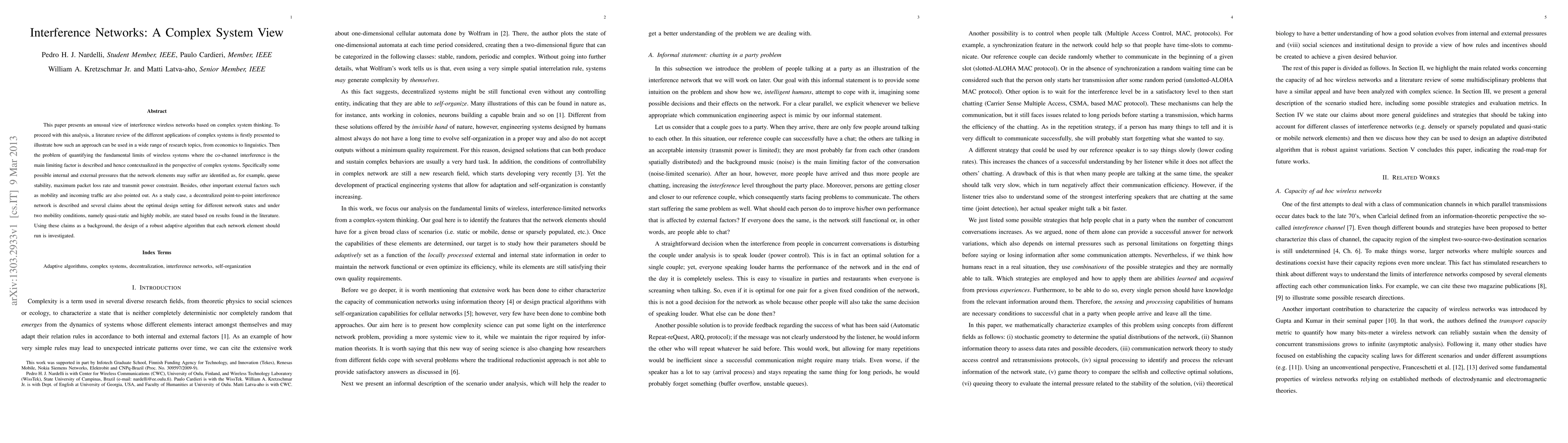 This paper presents an unusual view of interference wireless networks based on complex system thinking. To proceed with this analysis, a literature review of the different applications of complex systems is firstly presented to illustrate how such an approach can be used in a wide range of research topics, from economics to linguistics. Then the problem of quantifying the fundamental limits of wireless systems where the co-channel interference is the main limiting factor is described and hence contextualized in the perspective of complex systems. Specifically some possible internal and external pressures that the network elements may suffer are identified as, for example, queue stability, maximum packet loss rate and transmit power constraint. Besides, other important external factors such as mobility and incoming traffic are also pointed out. As a study case, a decentralized point-to-point interference network is described and several claims about the optimal design setting for different network states and under two mobility conditions, namely quasi-static and highly mobile, are stated based on results found in the literature. Using these claims as a background, the design of a robust adaptive algorithm that each network element should run is investigated.
