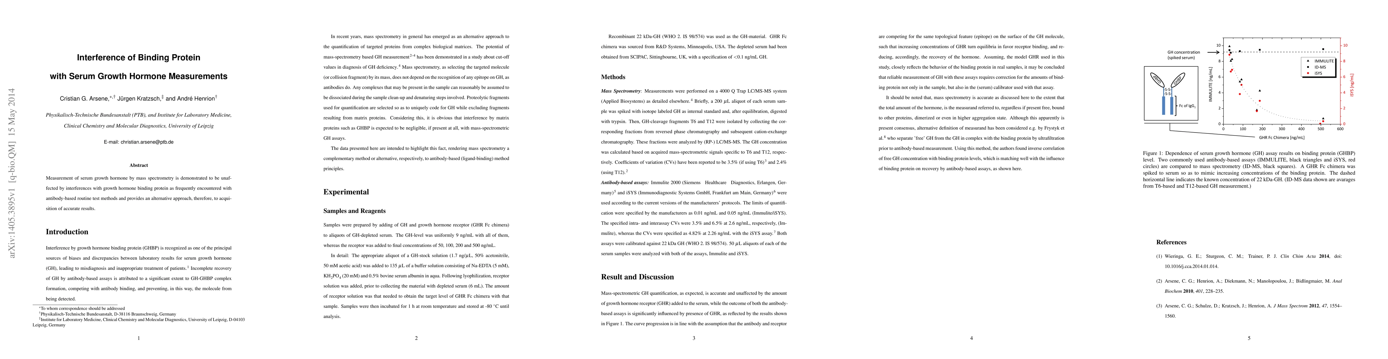 This study shows that mass spectrometry for serum growth hormone measurement is not affected by growth hormone binding protein interference, offering a more reliable alternative to antibody-based methods. This technique ensures accurate growth hormone results despite common interferences.