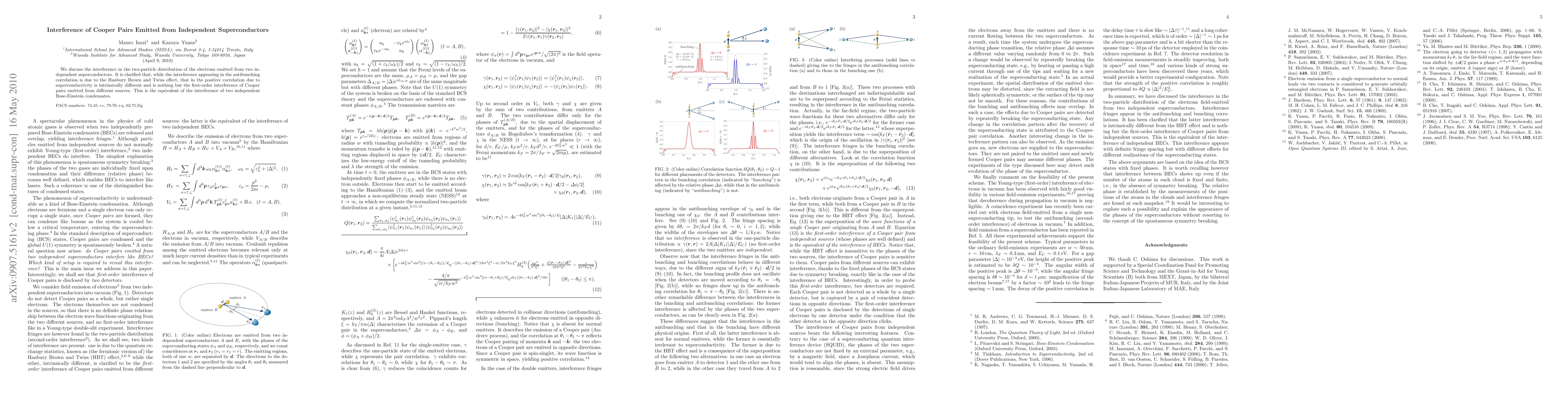 This paper explores the interference phenomena in the two-particle distribution of electrons emitted from two separate superconductors, distinguishing between the Hanbury Brown and Twiss effect and the unique first-order interference of Cooper pairs, akin to the interference of independent Bose-Einstein condensates.