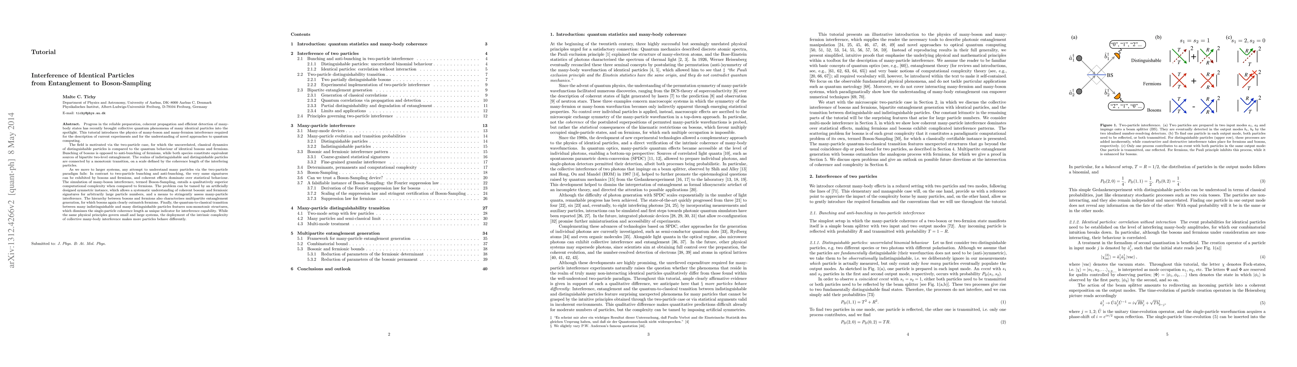 Progress in the reliable preparation, coherent propagation and efficient detection of many-body states has recently brought collective quantum phenomena of many identical particles into the spotlight. This tutorial introduces the physics of many-boson and many-fermion interference required for the description of current experiments and for the understanding of novel approaches to quantum computing. The field is motivated via the two-particle case, for which the uncorrelated, classical dynamics of distinguishable particles is compared to the quantum behaviour of identical bosons and fermions. Bunching of bosons is opposed to anti-bunching of fermions, while both species constitute equivalent sources of bipartite two-level entanglement. The realms of indistinguishable and distinguishable particles are connected by a monotonic transition, on a scale defined by the coherence length of the interfering particles. As we move to larger systems, any attempt to understand many particles via the two-particle paradigm fails: In contrast to two-particle bunching and anti-bunching, the very same signatures can be exhibited by bosons and fermions, and coherent effects dominate over statistical behaviour. The simulation of many-boson interference, termed Boson-Sampling, entails a qualitatively superior computational complexity when compared to fermions. The hierarchy between bosons and fermions also characterises multipartite entanglement generation, for which bosons again clearly outmatch fermions. Finally, the quantum-to-classical transition between many indistinguishable and many distinguishable particles features non-monotonic structures. While the same physical principles govern small and large systems, the deployment of the intrinsic complexity of collective many-body interference makes more particles behave differently.