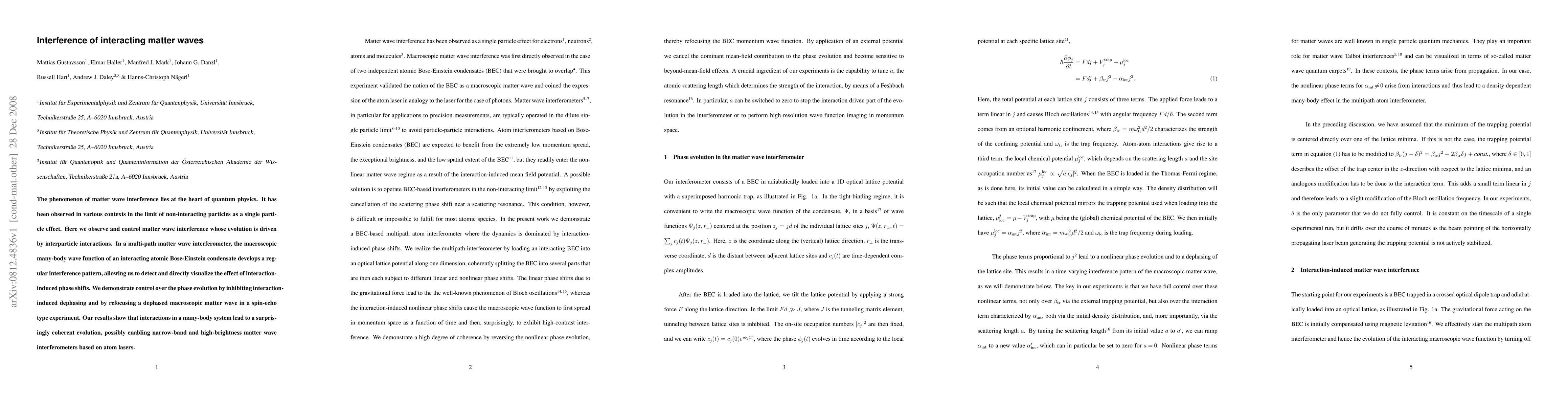 The phenomenon of matter wave interference lies at the heart of quantum physics. It has been observed in various contexts in the limit of non-interacting particles as a single particle effect. Here we observe and control matter wave interference whose evolution is driven by interparticle interactions. In a multi-path matter wave interferometer, the macroscopic many-body wave function of an interacting atomic Bose-Einstein condensate develops a regular interference pattern, allowing us to detect and directly visualize the effect of interaction-induced phase shifts. We demonstrate control over the phase evolution by inhibiting interaction-induced dephasing and by refocusing a dephased macroscopic matter wave in a spin-echo type experiment. Our results show that interactions in a many-body system lead to a surprisingly coherent evolution, possibly enabling narrow-band and high-brightness matter wave interferometers based on atom lasers.