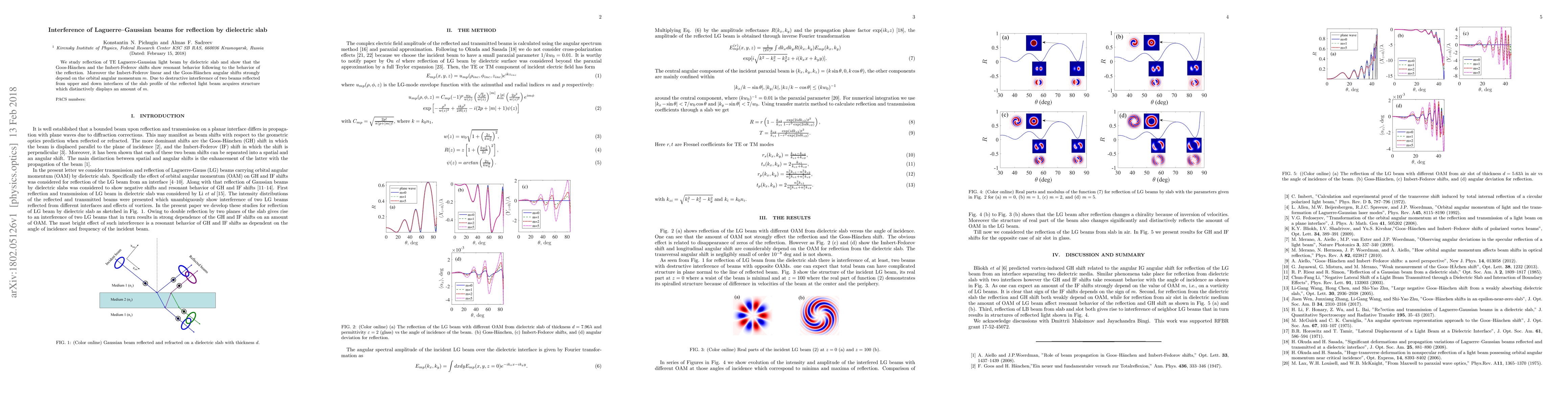 We study reflection of TE Laguerre-Gaussian light beam by dielectric slab and show that the Goos-H\"{a}nchen and the Imbert-Federov shifts show resonant behavior following to the behavior of the reflection. Moreover the Imbert-Federov linear and the Goos-H\"{a}nchen angular shifts strongly depend on the orbital angular momentum m. Due to destructive interference of two beams reflected from upper and down interfaces of the slab profile of the reflected light beam acquires structure which distinctively displays an amount of m.
