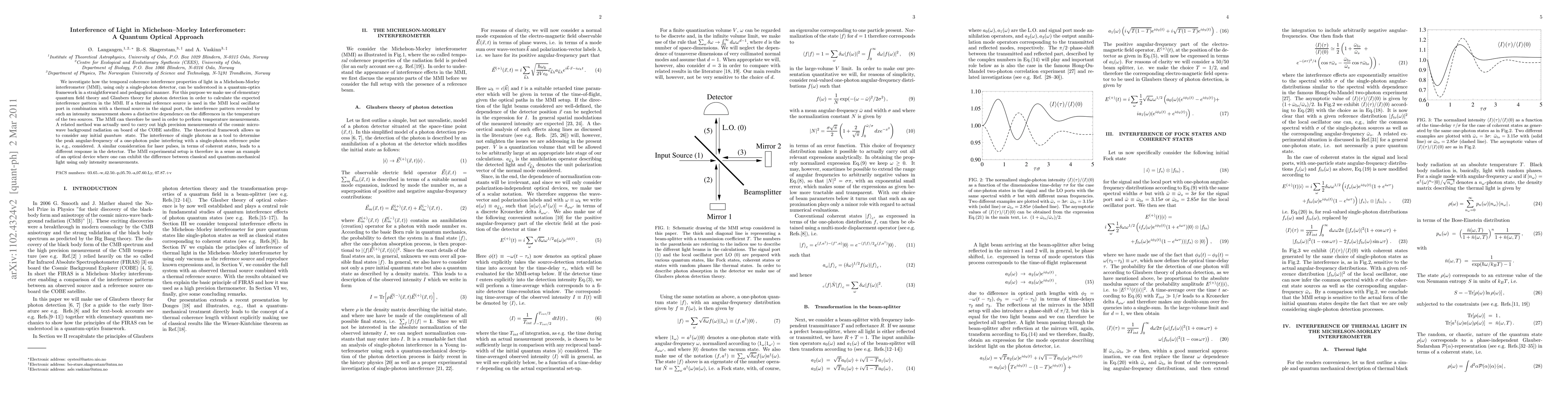 We investigate how the temporal coherence interference properties of light in a Michelson-Morley interferometer (MMI), using only a single-photon detector, can be understood in a quantum-optics framework in a straightforward and pedagogical manner. For this purpose we make use of elementary quantum field theory and Glaubers theory for photon detection in order to calculate the expected interference pattern in the MMI. If a thermal reference source is used in the MMI local oscillator port in combination with a thermal source in the signal port, the interference pattern revealed by such an intensity measurement shows a distinctive dependence on the differences in the temperature of the two sources. The MMI can therefore be used in order to perform temperature measurements. A related method was actually used to carry out high precision measurements of the cosmic micro-wave background radiation on board of the COBE satellite. The theoretical framework allows us to consider any initial quantum state. The interference of single photons as a tool to determine the angular peak-frequency of a one-photon pulse interfering with a single-photon reference pulse is, e.g., considered. A similar consideration for coherent laser pulses leads to a different response in the detector. The MMI experimental setup is therefore in a sense an example of an optical device where one can exhibit the difference between classical and quantum-mechanical light using only intensity measurements.