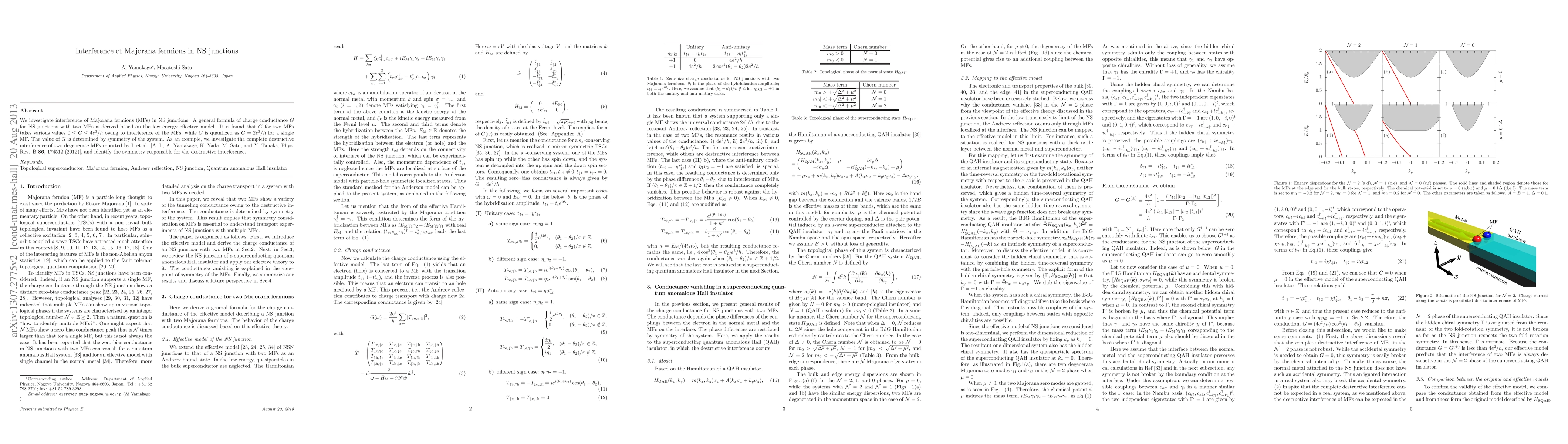 We investigate interference of Majorana fermions (MFs) in NS junctions. A general formula of charge conductance G for NS junctions with two MFs is derived based on the low energy effective model. It is found that G for two MFs takes various values 0 \leq G \leq 4e^2/h owing to interference of the MFs, while G is quantized as G = 2e^2/h for a single MF. The value of G is determined by symmetry of the system. As an example, we investigate the complete destructive interference of two degenerate MFs reported by Ii et al. [A. Ii, A. Yamakage, K. Yada, M. Sato, and Y. Tanaka, Phys. Rev. B 86, 174512 (2012)], and identify the symmetry responsible for the destructive interference.