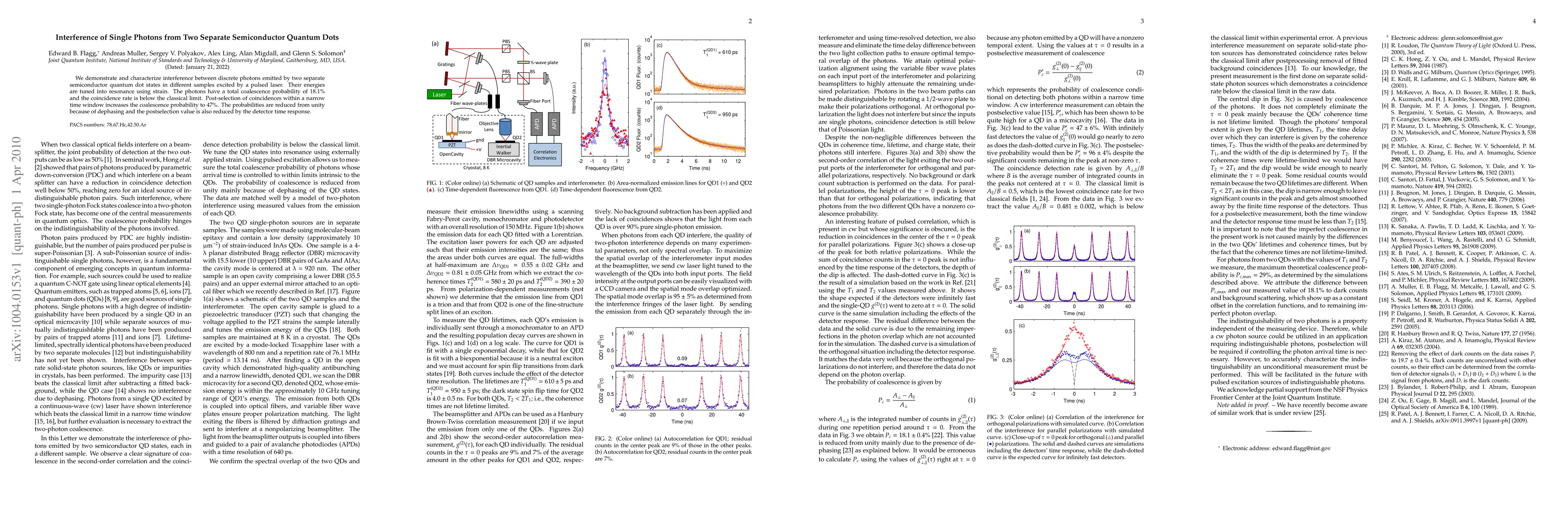 We demonstrate and characterize interference between discrete photons emitted by two separate semiconductor quantum dot states in different samples excited by a pulsed laser. Their energies are tuned into resonance using strain. The photons have a total coalescence probability of 18.1% and the coincidence rate is below the classical limit. Post-selection of coincidences within a narrow time window increases the coalescence probability to 47%. The probabilities are reduced from unity because of dephasing and the postselection value is also reduced by the detector time response.