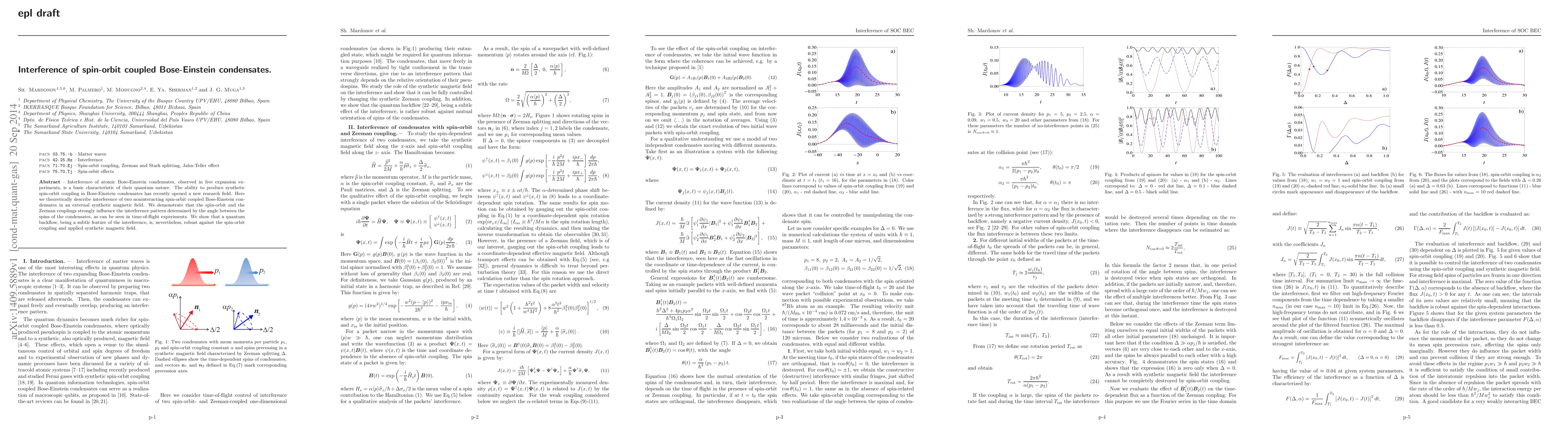 Interference of atomic Bose-Einstein condensates, observed in free expansion experiments, is a basic characteristic of their quantum nature. The ability to produce synthetic spin-orbit coupling in Bose-Einstein condensates has recently opened a new research field. Here we theoretically describe interference of two noninteracting spin-orbit coupled Bose-Einstein condensates in an external synthetic magnetic field. We demonstrate that the spin-orbit and the Zeeman couplings strongly influence the interference pattern determined by the angle between the spins of the condensates, as can be seen in time-of-flight experiments. We show that a quantum backflow, being a subtle feature of the interference, is, nevertheless, robust against the spin-orbit coupling and applied synthetic magnetic field.