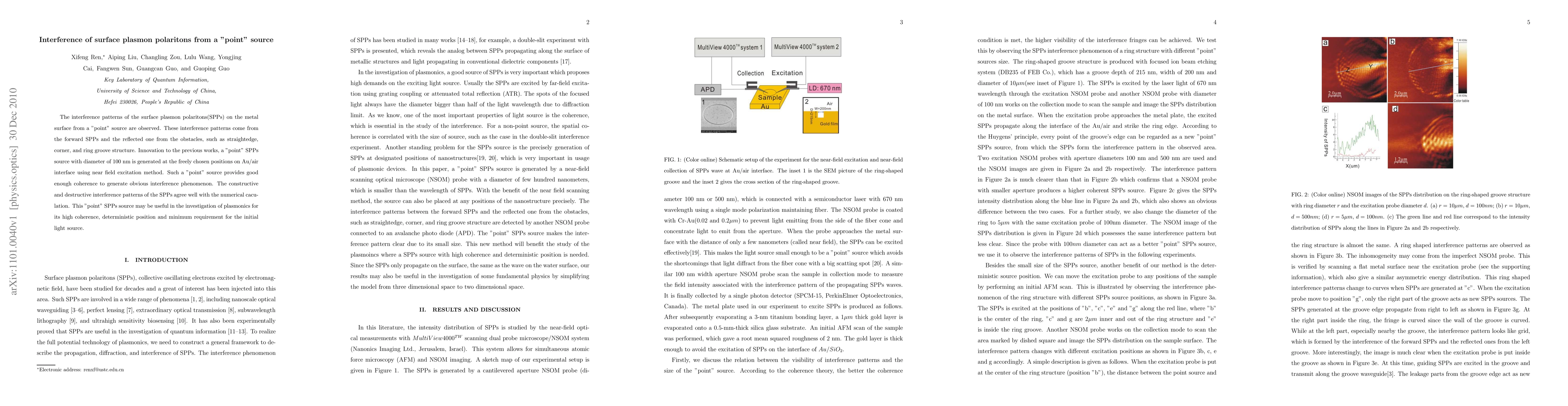 The interference patterns of the surface plasmon polaritons(SPPs) on the metal surface from a "point" source are observed. These interference patterns come from the forward SPPs and the reflected one from the obstacles, such as straightedge,corner, and ring groove structure. Innovation to the previous works, a "point" SPPs source with diameter of 100 nm is generated at the freely chosen positions on Au/air interface using near field excitation method. Such a "point" source provides good enough coherence to generate obvious interference phenomenon. The constructive and destructive interference patterns of the SPPs agree well with the numerical caculation. This "point" SPPs source may be useful in the investigation of plasmonics for its high coherence, deterministic position and minimum requirement for the initial light source.