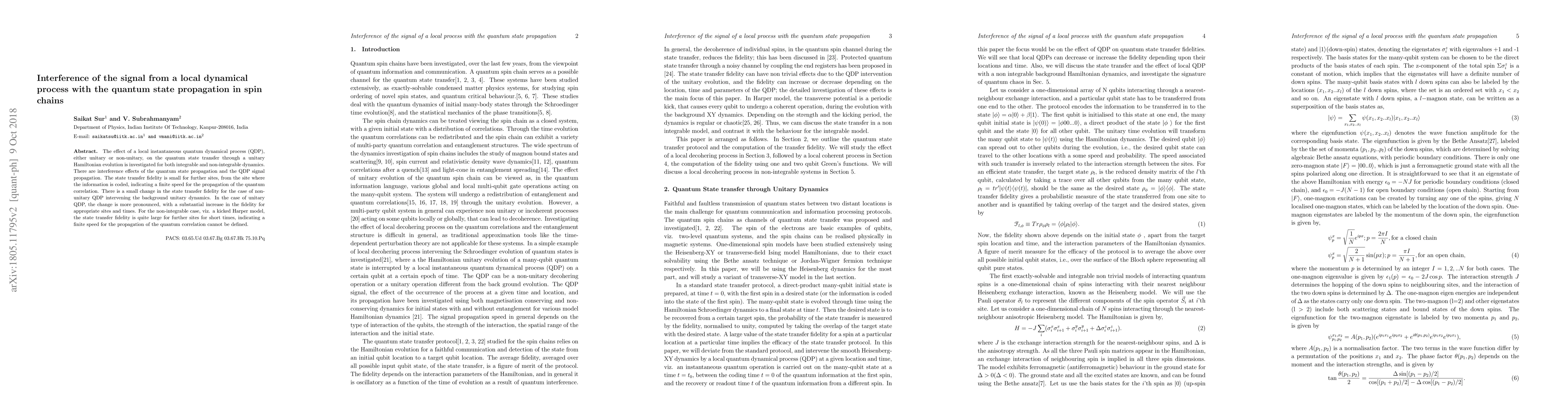 The effect of a local instantaneous quantum dynamical process (QDP), either unitary or non-unitary, on the quantum state transfer through a unitary Hamiltonian evolution is investigated for both integrable and non-integrable dynamics. There are interference effects of the quantum state propagation and the QDP signal propagation. The state transfer fidelity is small for further sites, from the site where the information is coded, indicating a finite speed for the propagation of the quantum correlation. There is a small change in the state transfer fidelity for the case of non- unitary QDP intervening the background unitary dynamics. In the case of unitary QDP, the change is more pronounced, with a substantial increase in the fidelity for appropriate sites and times. For the non-integrable case, viz. a kicked Harper model, the state transfer fidelity is quite large for further sites for short times, indicating a finite speed for the propagation of the quantum correlation cannot be defined.