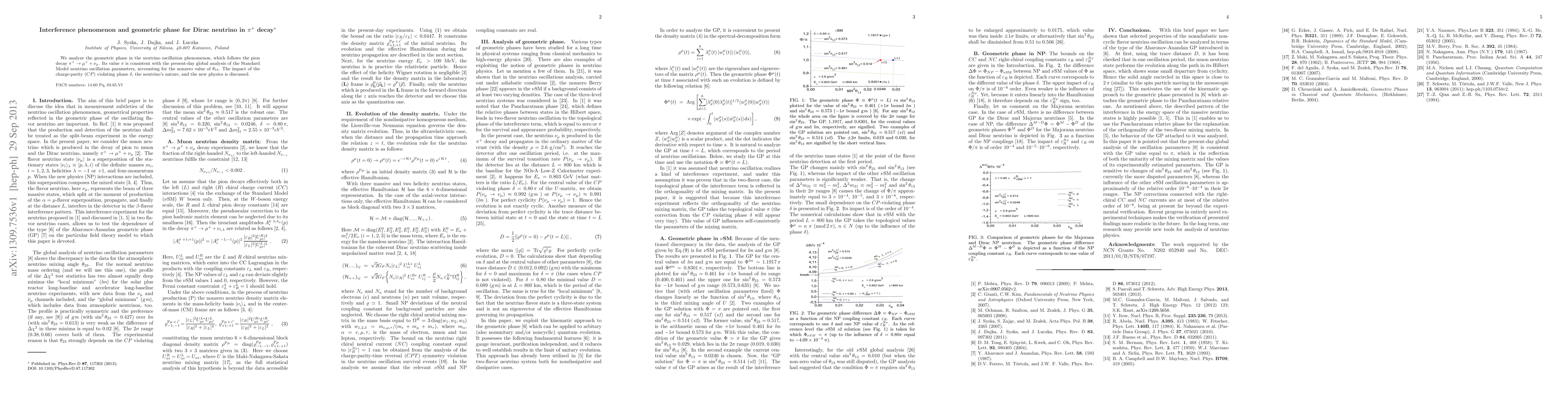 We analyze the geometric phase in the neutrino oscillation phenomenon, which follows the pion decay \pi+ --> \mu+ + \nu_{\mu}. Its value \pi is consistent with the present-day global analysis of the Standard Model neutrino oscillation parameters, accounting for the nonzero value of \theta_13. The impact of the charge-parity (CP) violating phase \delta, the neutrino's nature, and the new physics is discussed.