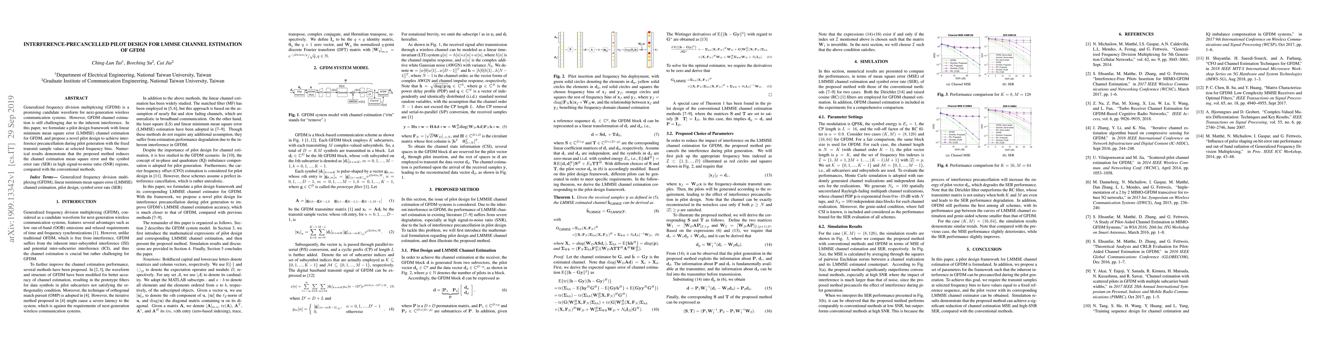 This paper proposes a novel pilot design framework for GFDM channel estimation that incorporates interference precancellation, utilizing linear minimum mean square error (LMMSE) techniques. The method achieves significant reductions in channel estimation mean square error and symbol error rate in high SNR conditions compared to conventional methods.