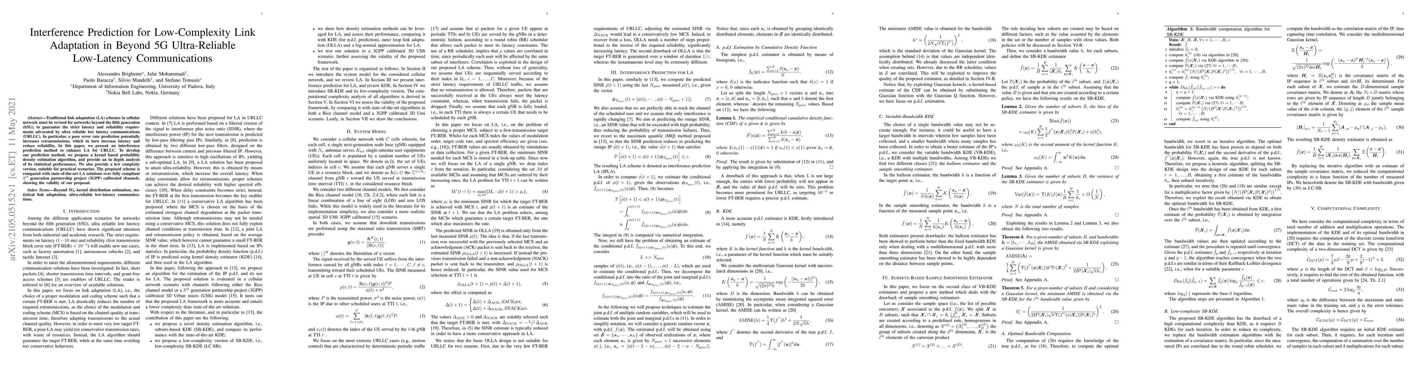 Traditional link adaptation (LA) schemes in cellular network must be revised for networks beyond the fifth generation (b5G), to guarantee the strict latency and reliability requirements advocated by ultra reliable low latency communications (URLLC). In particular, a poor error rate prediction potentially increases retransmissions, which in turn increase latency and reduce reliability. In this paper, we present an interference prediction method to enhance LA for URLLC. To develop our prediction method, we propose a kernel based probability density estimation algorithm, and provide an in depth analysis of its statistical performance. We also provide a low complxity version, suitable for practical scenarios. The proposed scheme is compared with state-of-the-art LA solutions over fully compliant 3rd generation partnership project (3GPP) calibrated channels, showing the validity of our proposal.