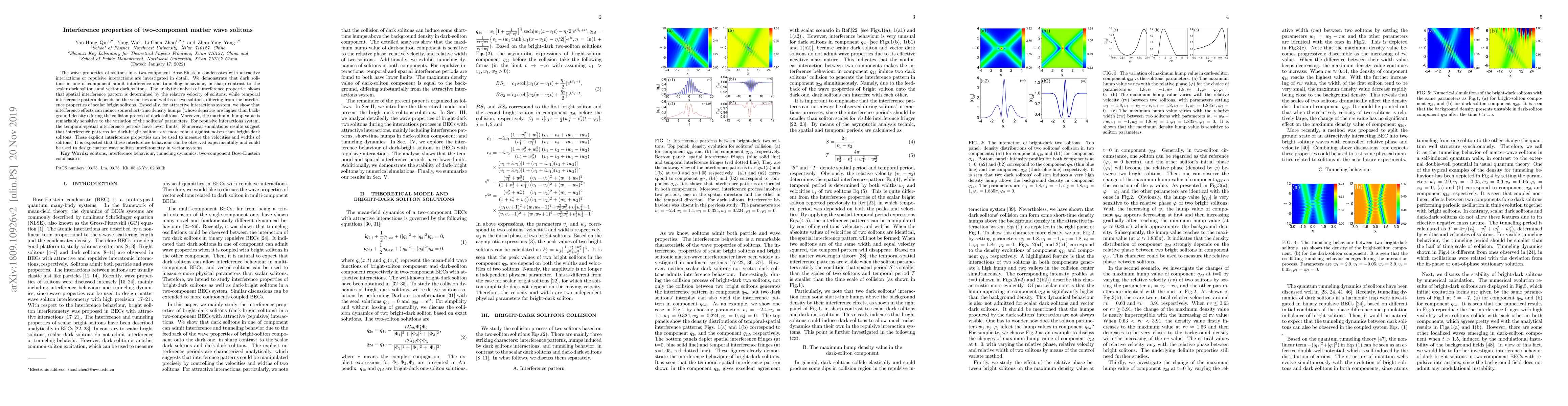 This paper investigates the interference properties of two-component matter wave solitons in Bose-Einstein condensates, showing that dark solitons exhibit unique interference and tunneling behavior. The study reveals that the interference patterns depend on soliton velocities and widths, with notable density humps appearing during collisions in attractive interaction systems.