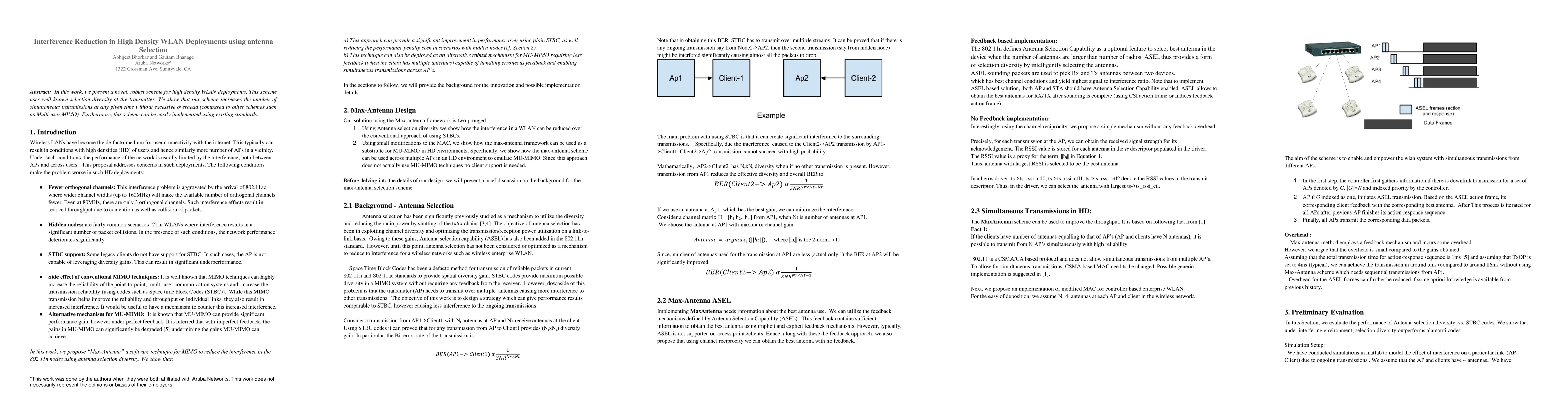 In this work, we present a novel, robust scheme for high density WLAN deployments. This scheme uses well known selection diversity at the transmitter. We show that our scheme increases the number of simultaneous transmissions at any given time without excessive overhead (compared to other schemes such as Multi-user MIMO). Furthermore, this scheme can be easily implemented using existing standards.